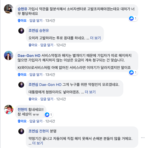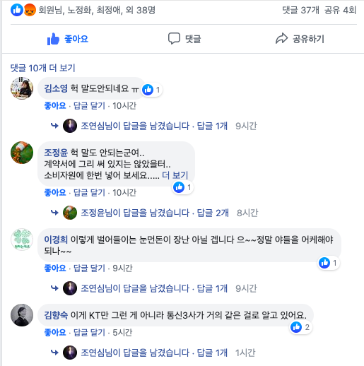 사연을 다 들었고, 원래 규정에는 없는데 자기 직권으로 6개월 분량을 환불해줄 수 있다는 거였습니다. 거기가 환불규정 자체가 없어서 그것도 자기 재량으로 그냥 해주는 거라고.. 무슨 선심쓰듯 말했습니다. 분명 약정기간 동안 성실납부를 했고, 그 후에도 다른 서비스에 한번도 연체도 없이 성실하게 납부하고, 심지어 쓰지도 않은 데이터 요금을 빼간 KT가 소비자에게 저렇게 대응한다는 게 열이 받았습니다. 모든 KT 서비스를 중단하고 불매운동이라도 벌이고 싶어졌습니다.