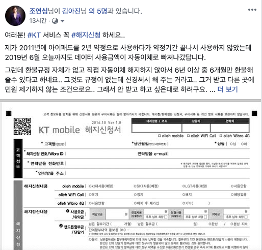 사연: 2년 약정기간 끝나고 자동이체 해지 안 했더니 쓰지도 않은 데이터 요금을 6년 넘게 출금해간 KT를