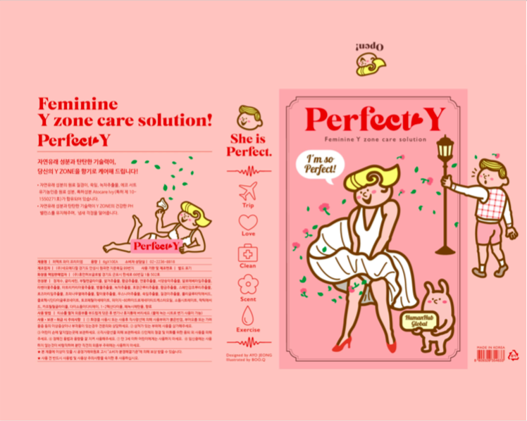 그래서 가장 큰 성장세에 있는 여성청결제 시장에 집중하게 되었습니다. 앰플 형태로 된 제품들이 하나둘 출시되고 있었는데 물티슈 형태의 간편한 제품은 거의 없는 상태라 여성청결티슈 [퍼펙트와이]를 출시하게 된 거죠. 요즘 세대들이 좋아하는 일러스트레이터와의 콜라보로 그들의 마음을 사로잡을 수 있기를 기대하고 있습니다.