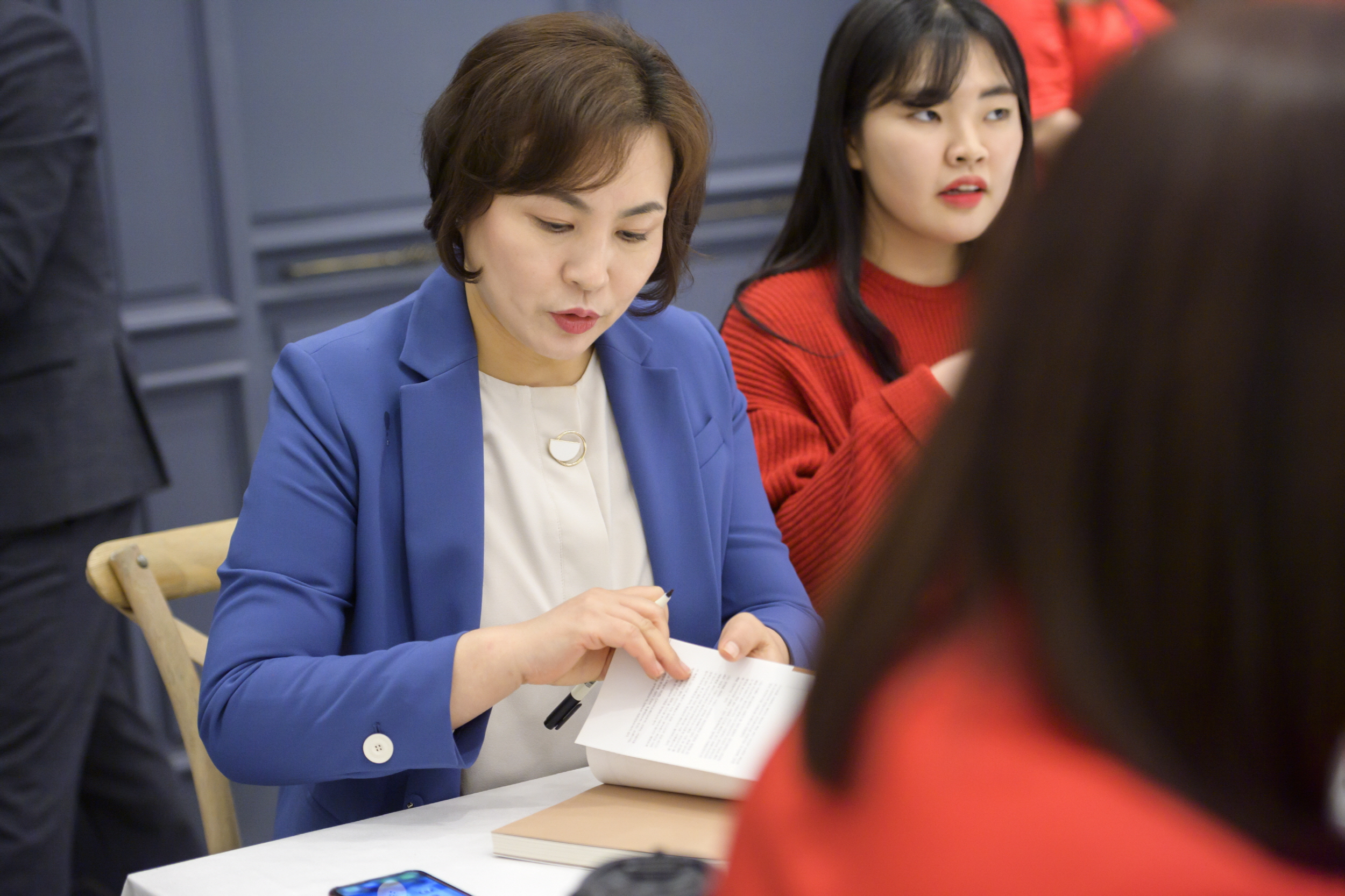 이날 의상코드가 레드 & 골드였다는데 나만 블루로 눈에 확 띄인다. 이것도 비주얼 전략이라고 해야 하나!