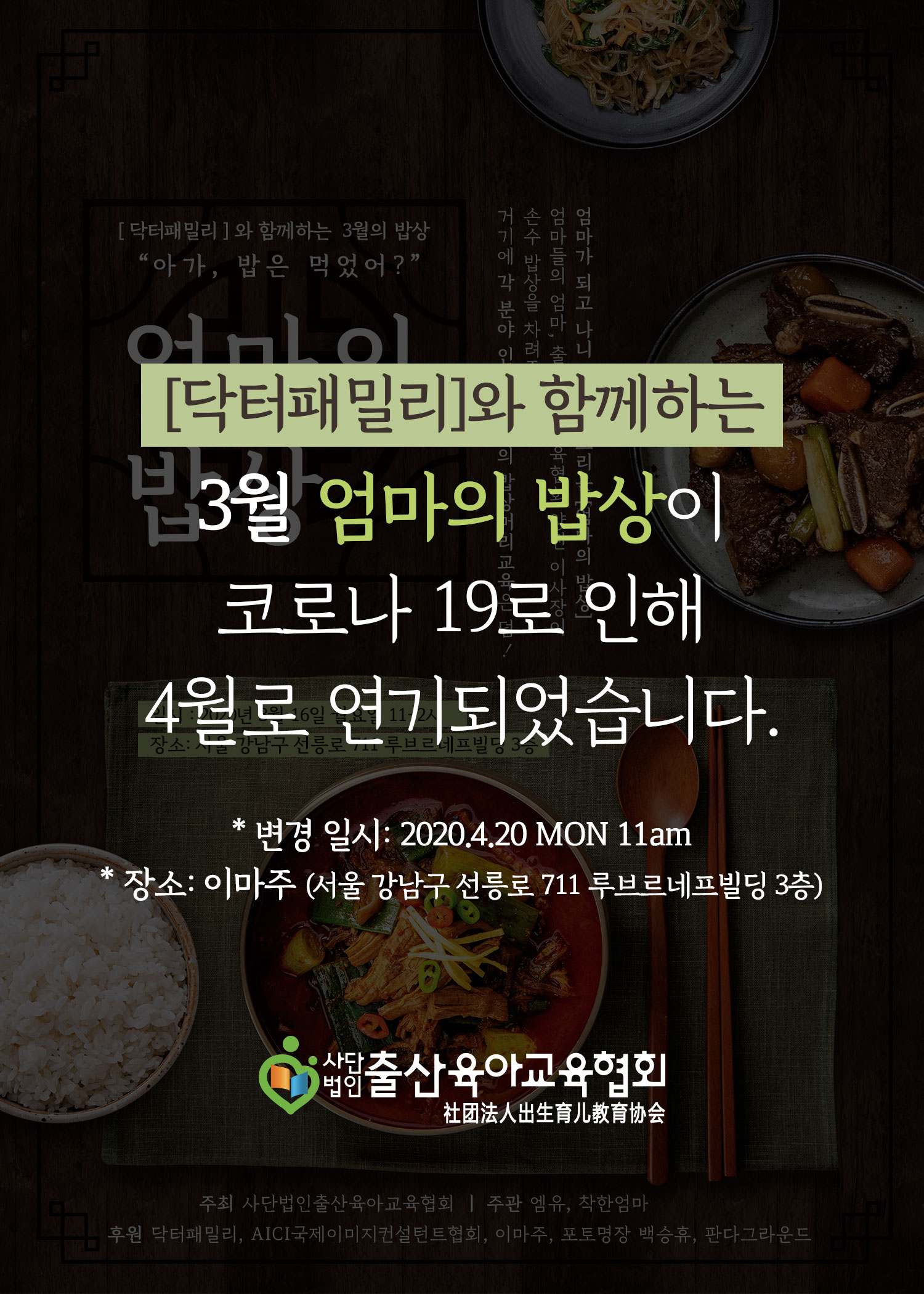 (사)출산육아교육협회 3월의 엄마의밥상이 코로나19로 4월의밥상으로 연기되었습니다.