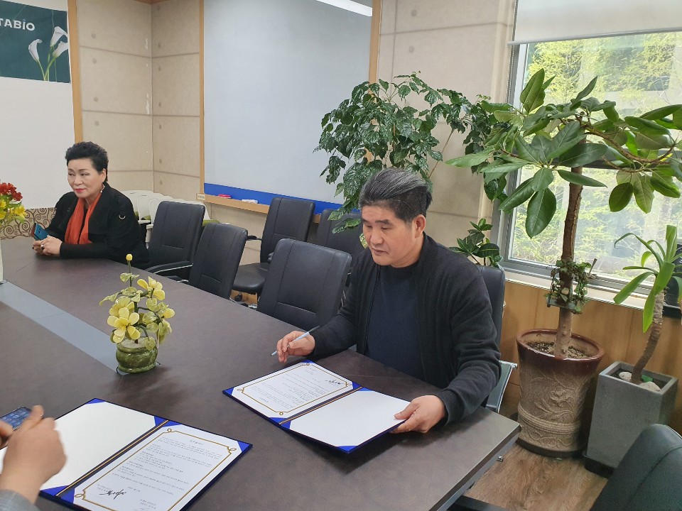 (주)더브레스코리아 단장 장동렬과 (주)엠유 산타바이오 대표 조연심은 업무협약을 통해