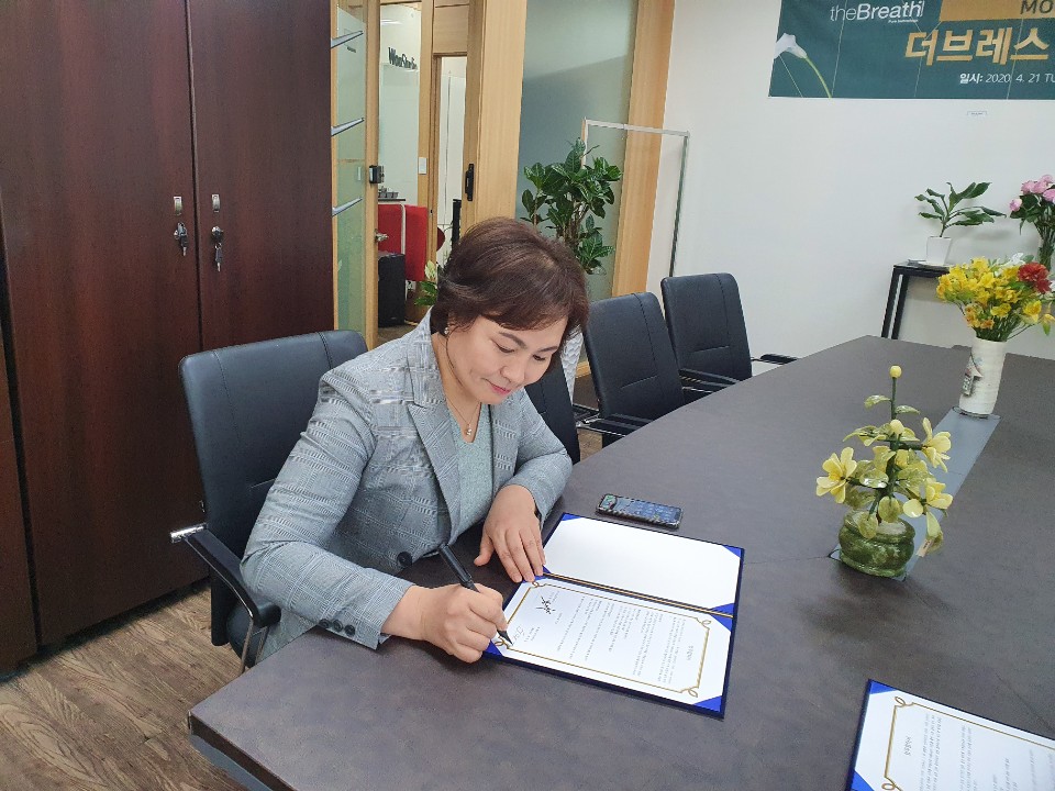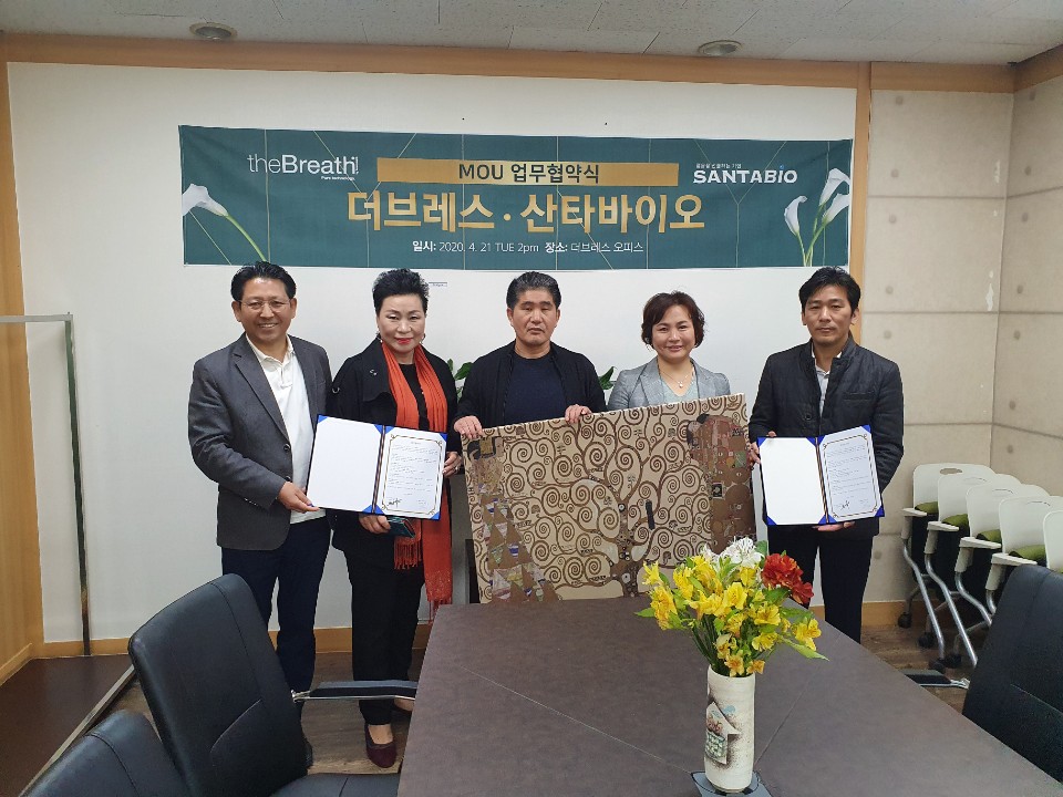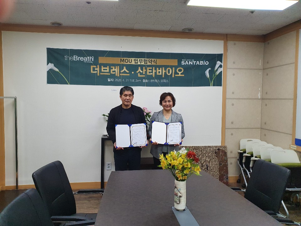 2020년 4월 21일 화요일 오후 2시 구로 에이스트윈타워 1차 409호 더브레스 오피스에서 국민생활환경개선을 통한 국민생활복지향상을 실천하는 스마트혁신기업 더브레스와 젊음을 선물하는 기업 산타바이오의 업무협약식이 진행되었다.