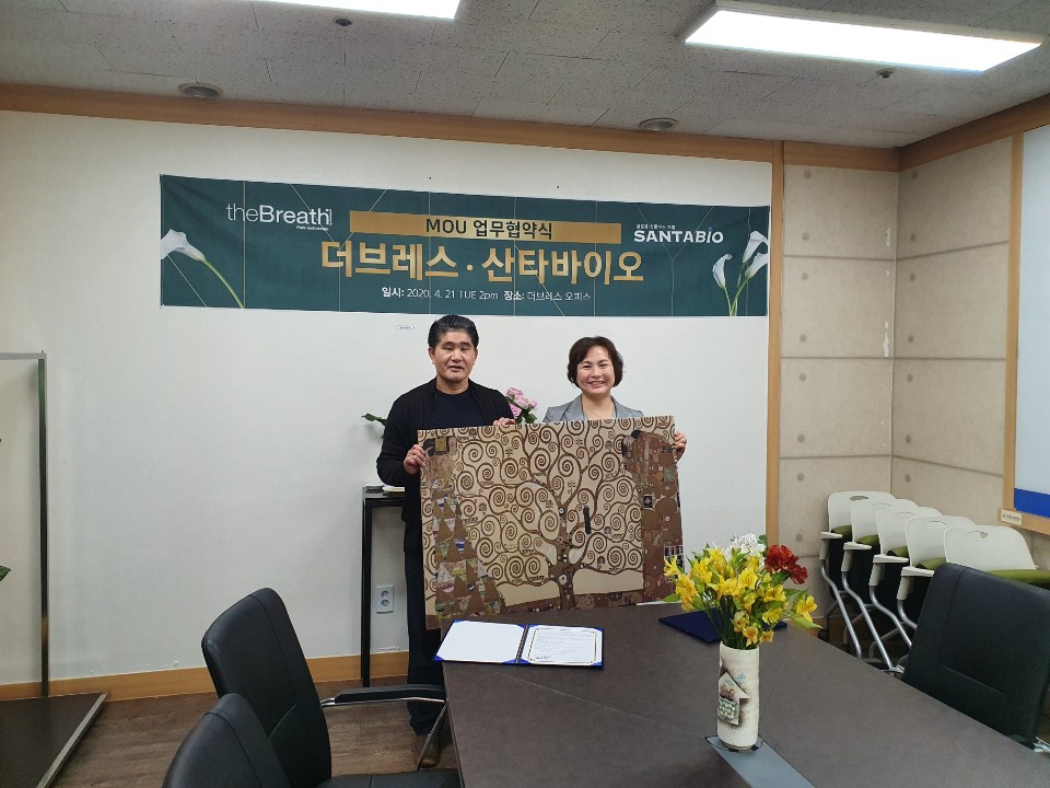 2020년 4월 21일 화요일 오후 2시 구로 에이스트윈타워 1차 409호 더브레스 오피스에서 국민생활환경개선을 통한 국민생활복지향상을 실천하는 스마트혁신기업 더브레스와 젊음을 선물하는 기업 산타바이오의 업무협약식이 진행되었다.
