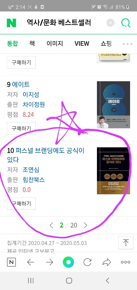 밤 늦게 귀가했는데 김진향 작가의 반가운 카톡은 [퍼스널브랜딩에도 공식이 있다]가 교보문고 자기계발 베스트 6위에 올랐다는 제보였다.