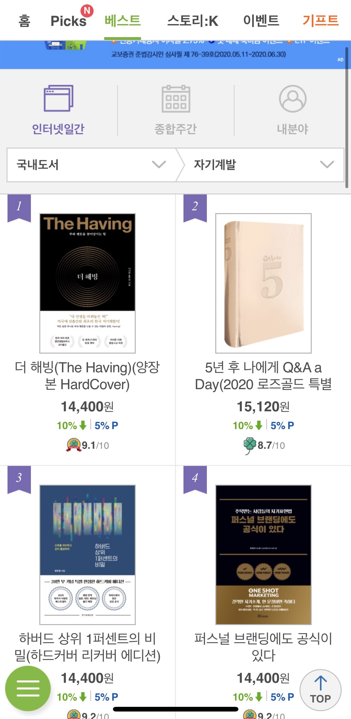 모바일 교보문고 자기계발 베스트셀러 #4위에 올랐네요.