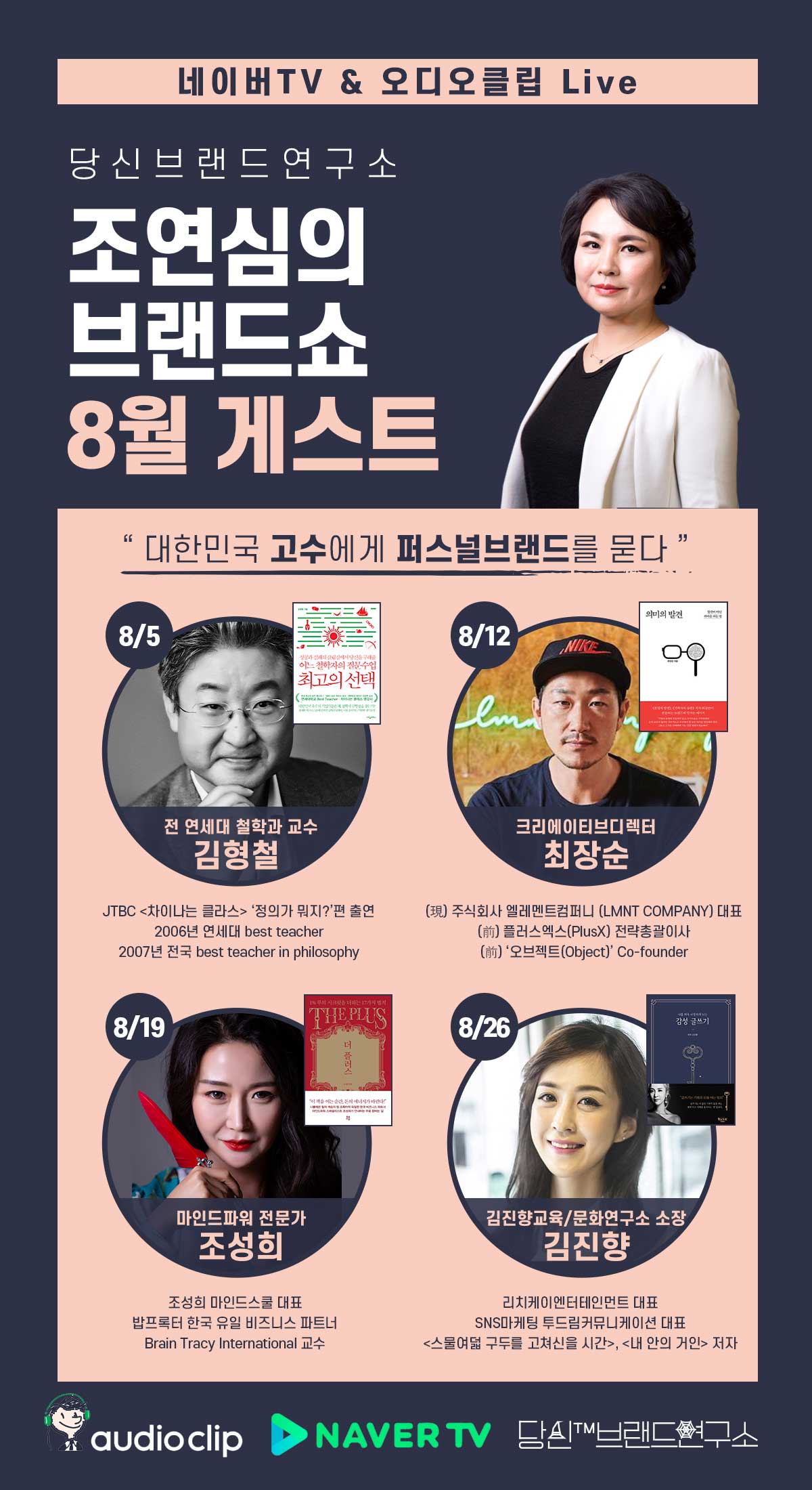 넷, 네이버 오디오클립 & 네이버TV 당신브랜드연구소 [조연심의 브랜드쇼] 8월 게스트 확정으로 포스터 발행! 우와~~ 이 멋진 분들과 함께 라이브로 그들의 퍼스널브랜딩 스토리를 들어보는 시간! 기대하셔도 좋아요. 이렇게 오늘 하루도 다채롭게 지나갔네요.