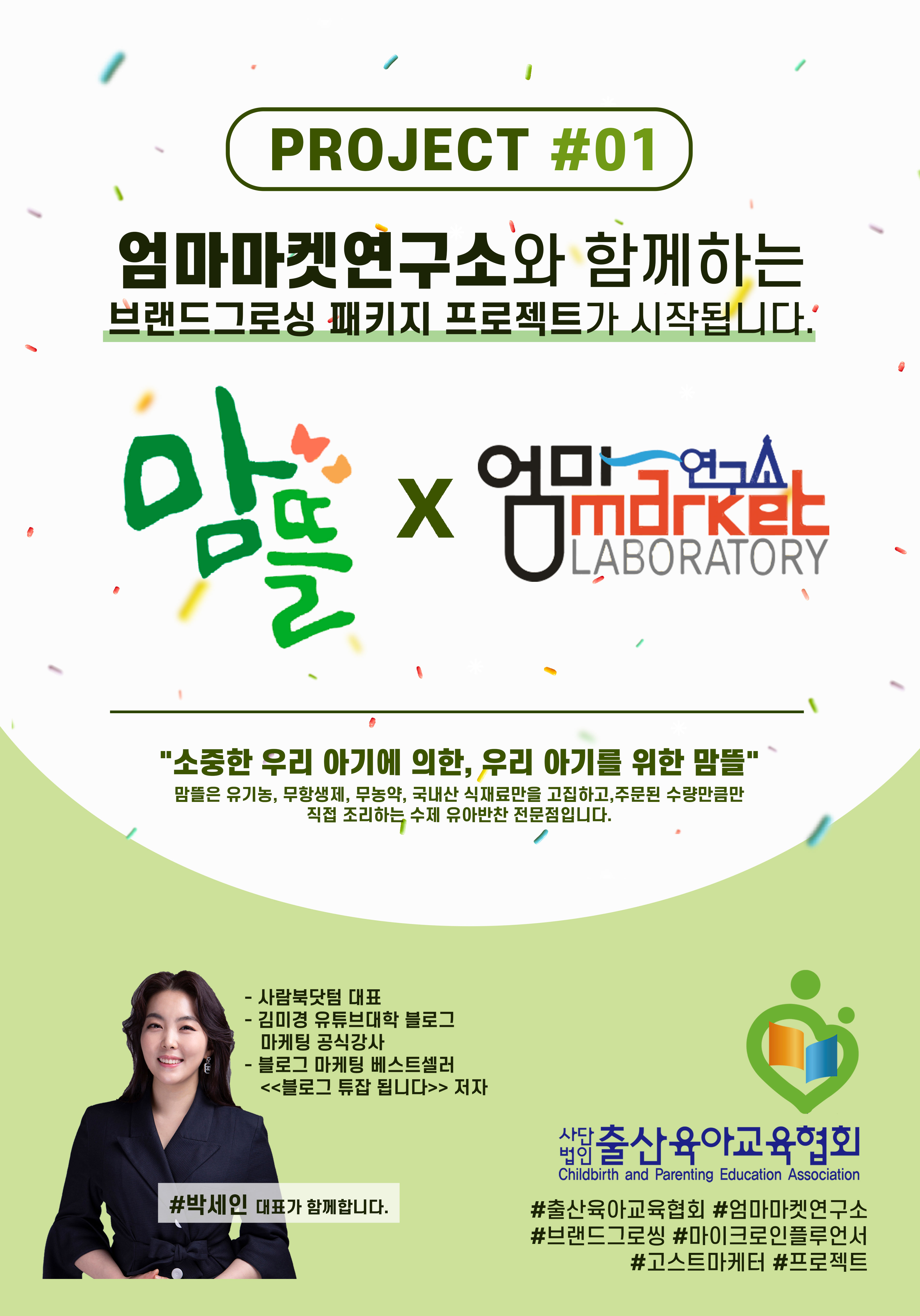 둘, #출산육아교육협회 산하 #엄마마켓연구소에서 유아수제 유기농반찬 #맘뜰과 브랜딩 프로젝트를 런칭했어요. 내일 밤 9시-11시 #마이크로인플루언서 #박세인 대표의 블로그 특강과 우수 리뷰어와 함께 기업홍보영상 제작 참여까지 함께 하게 될 이번 프로젝트! 벌써 많이 참가신청해 주셨네요. #엠유 공식 블로그에서 확인 후 신청하시면 됩니다.