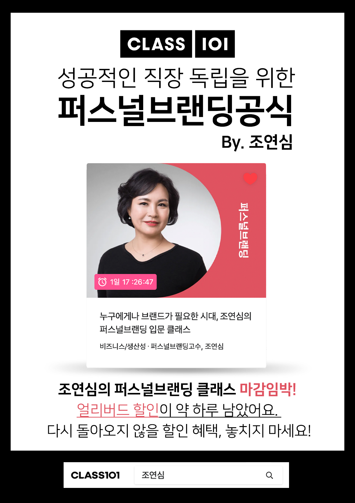 성공적인 직장독립을 위한 조연심의 #퍼스널브랜딩공식 50강 넘는 강의를 듣고 나면 확실히 알게 되실 거에요. 퍼스널브랜딩은 쉽게 만들어지는 게 아니라는 것을요! 하지만 누구나 맘만 먹으면 만들 수 있다는 것을요. 빈 페이지에서 시작하고 언제고 자발적 베타상태에 머물 용기만 있다면 가능하답니다.