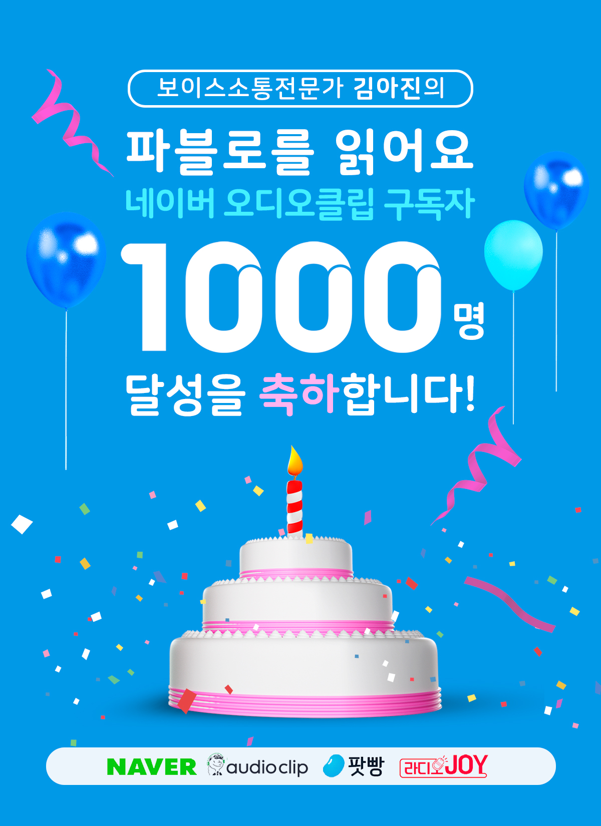 셋, 축하해해주세요. 네이버 오디오클립 책읽어주는라디오 #파블로를읽어요 구독자 1000명이 되었답니다. #김아진 아나운서가 홀로 묵묵히 진행하는 이 방송에 많은 분들이 거쳐간 거 아시죠?
