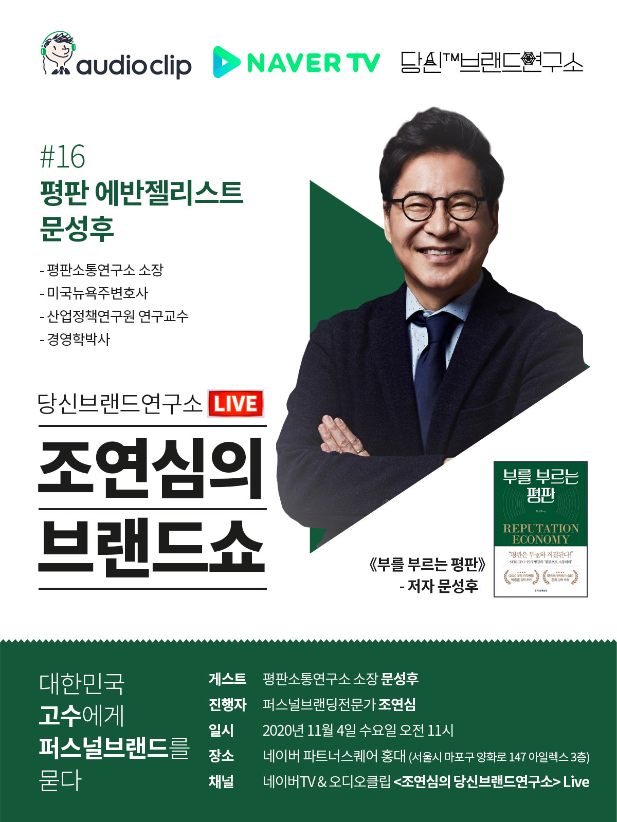 네이버 오디오클립 x 네이버TV #당신브랜드연구소 #조연심의브랜드쇼 11월 초대게스트가 확정되었습니다.