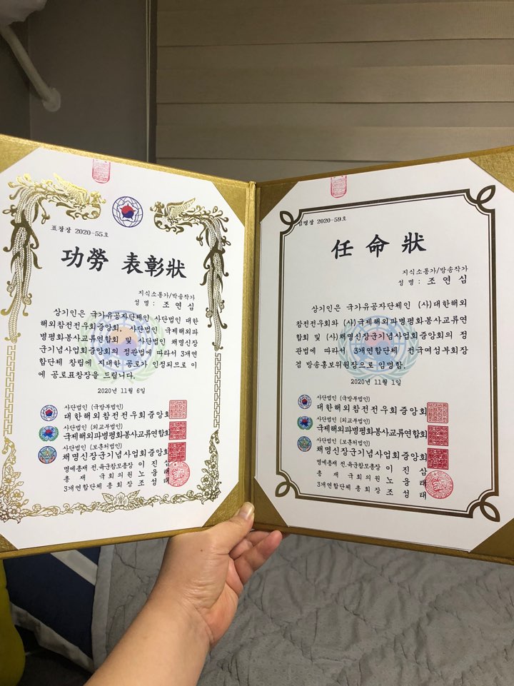국방부, 외교부, 보훈처 산하 3개 단체연합 전국여성부회장겸 방송홍보위원장으로 임명받았답니다. 추천해주신 조평열 법률박사님께 감사드립니다. 유비엔국제재단 정혜정 이사장님도 함께 임명장을 받았답니다.