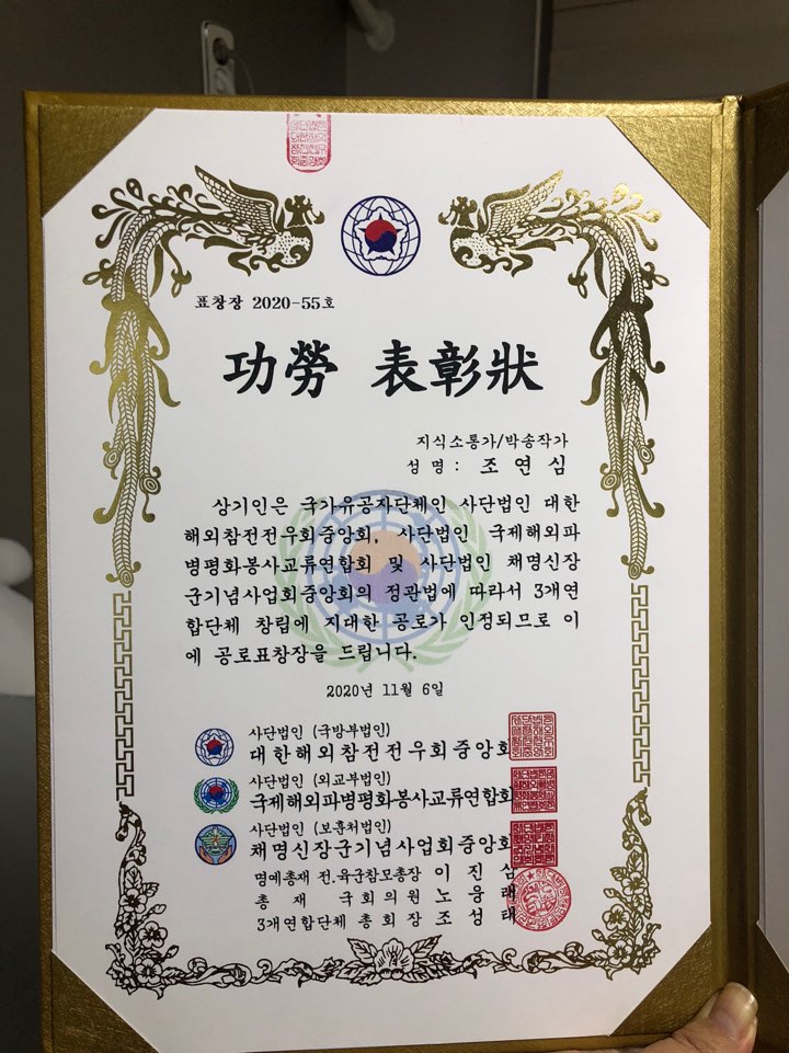 오늘 너무 과분한 임명장과 공로 표창장을 받았습니다.