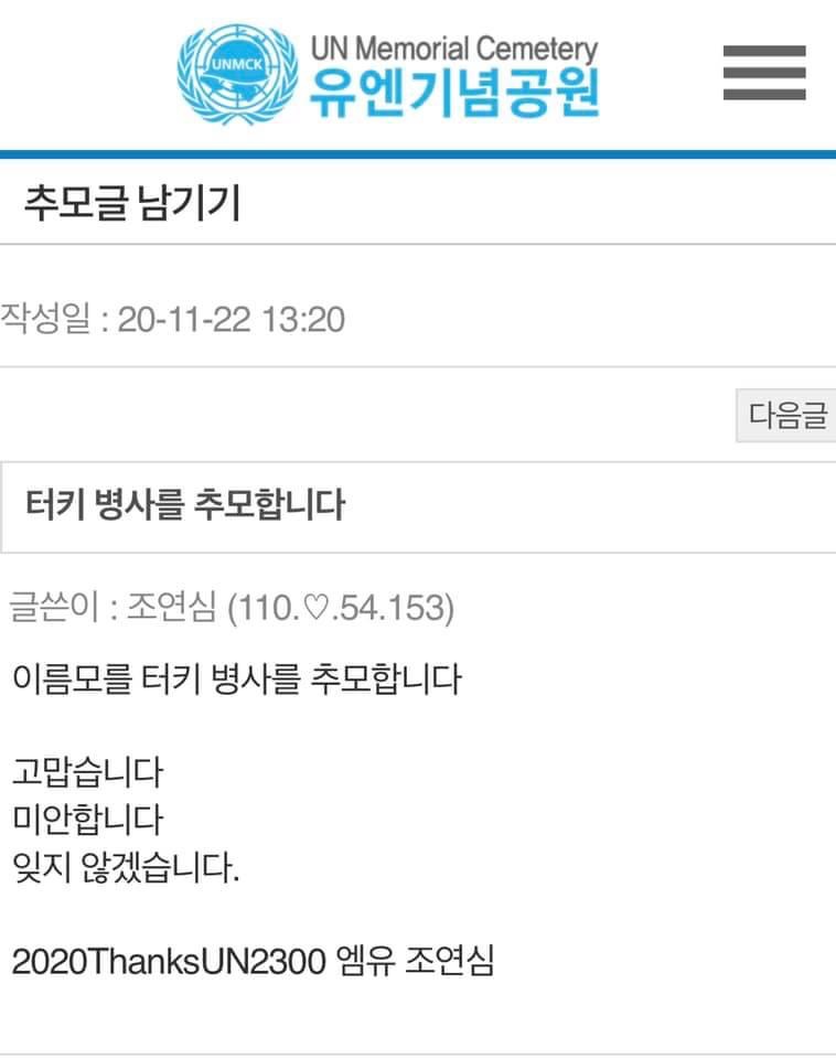 #터키병사 #아무개님의 지목을 받아 7일간 추모를 이어가는 2020ThanksUN2300 온라인추모 플래시몹니다.