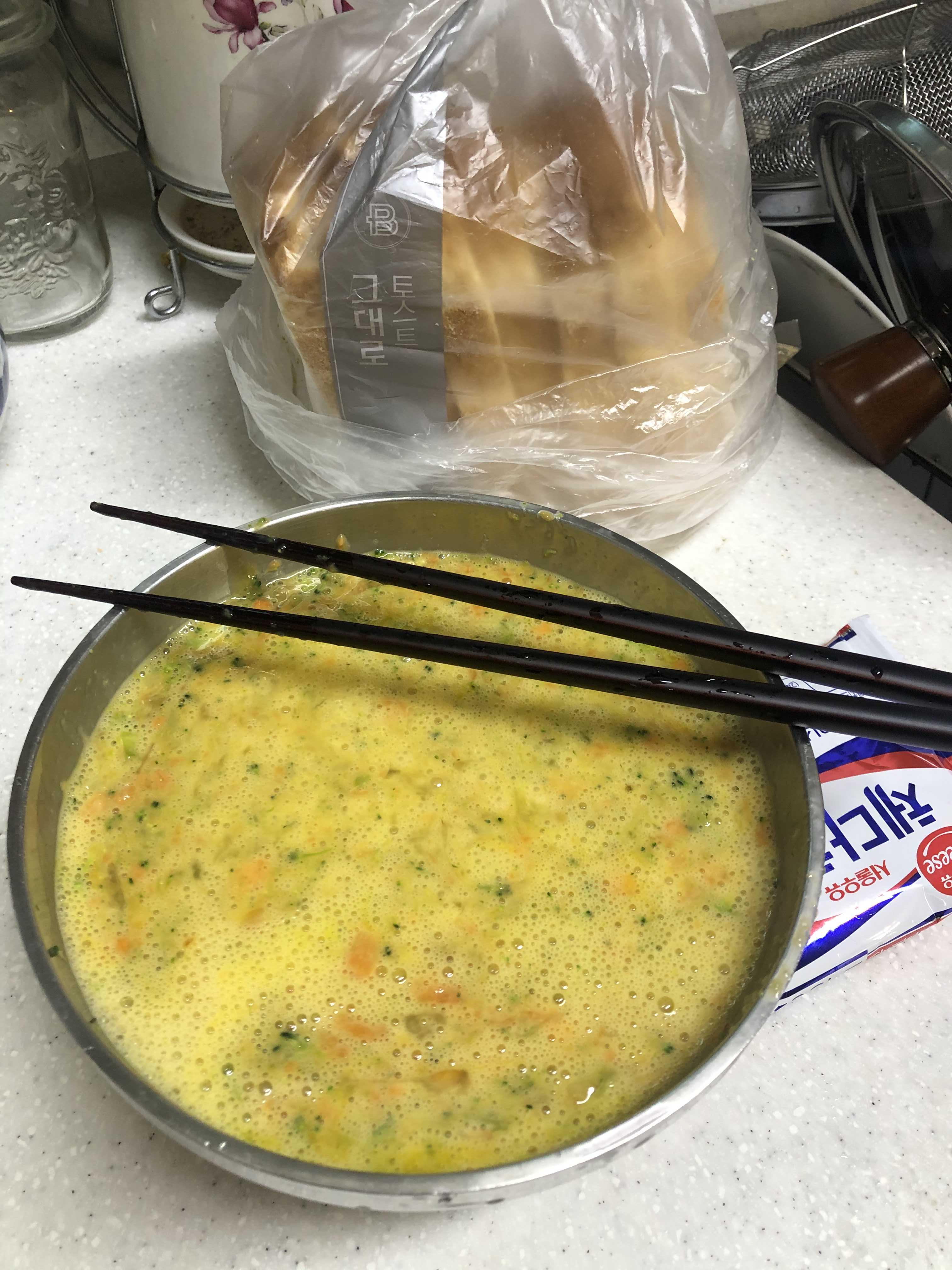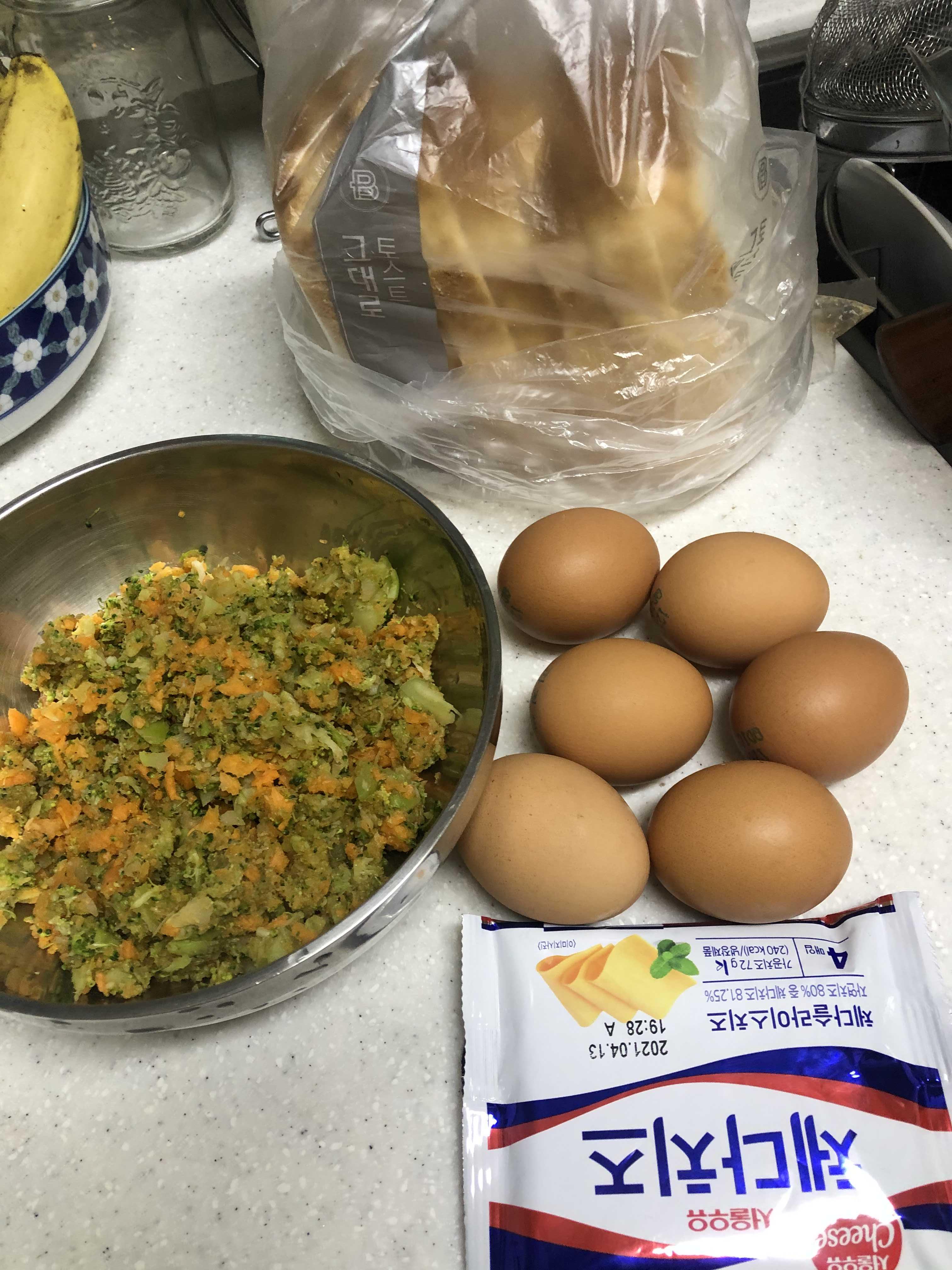 준비물: 브로컬리 밑둥, 당근, 계란, 식빵, 치즈, 버터, 설탕, 케첩.