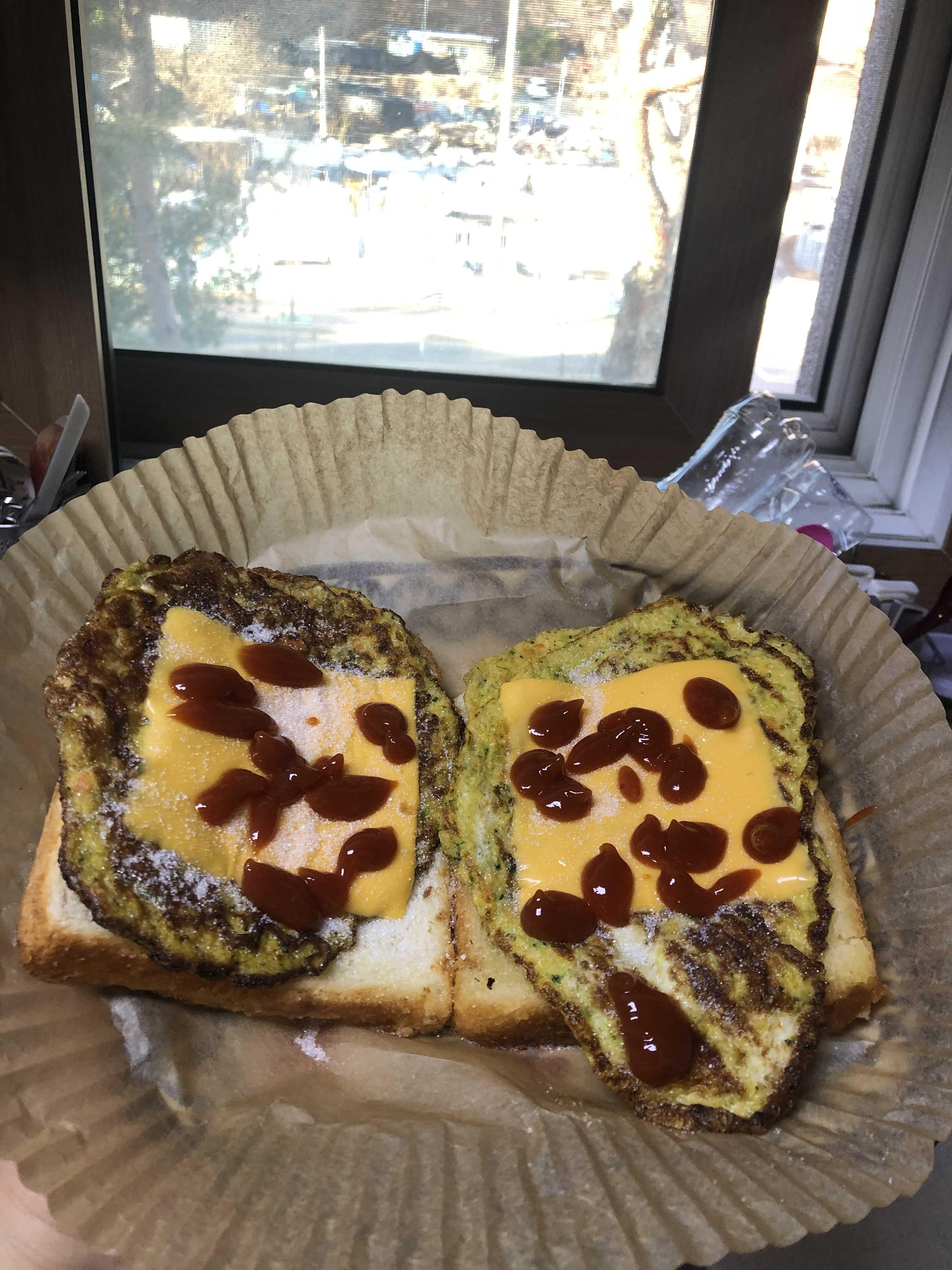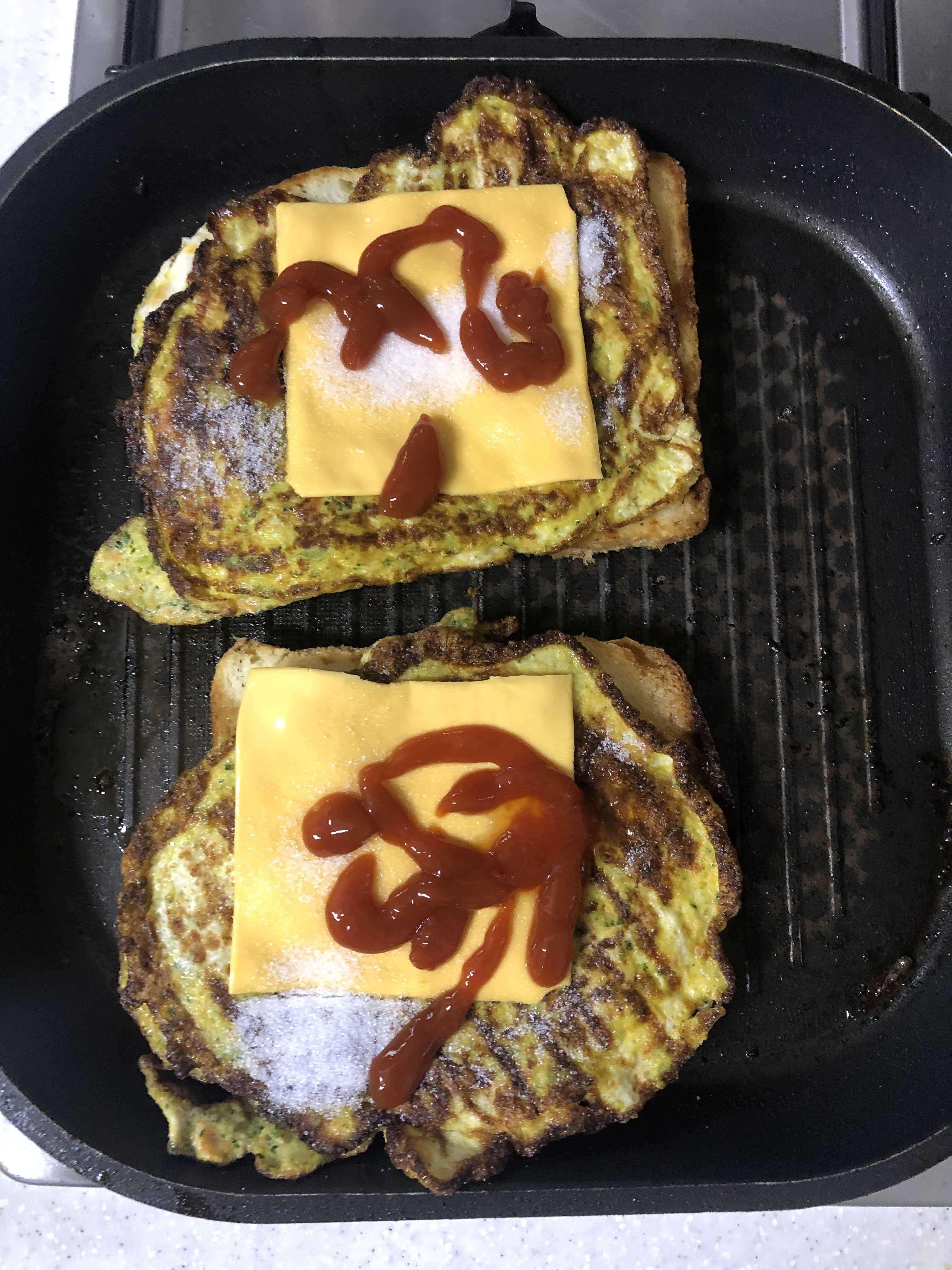 6. 구운 식빵위에 계란+야채범벅을 올리고 치즈 한 장 얹고 설탕 솔솔 뿌리고 케첩 뿌려주면 완성