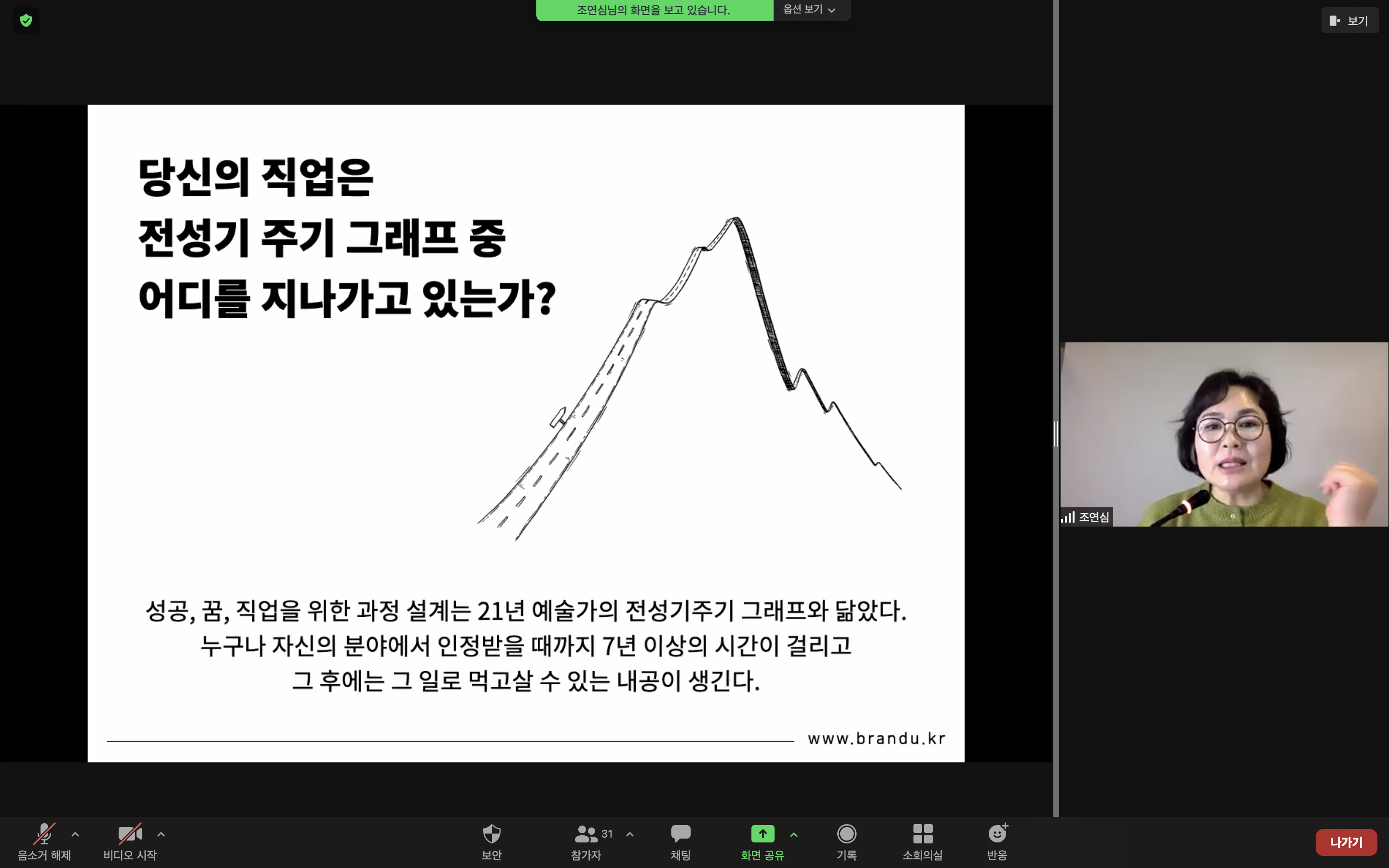 퍼스널브랜딩을 만들어가는 조연심도 길고 지루한 시간을 견뎌 저의 분야에서 전성기를 만들기 위해 하루하루 나와의 싸움에서 이기려고 노력 중입니다.