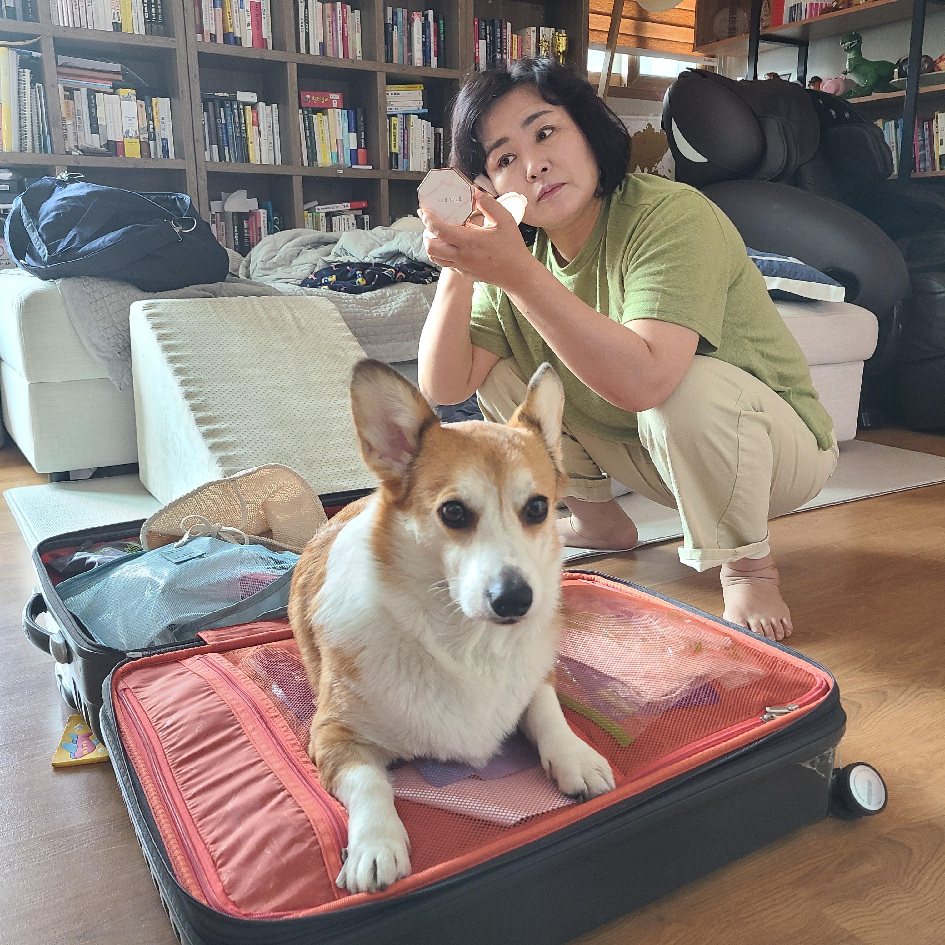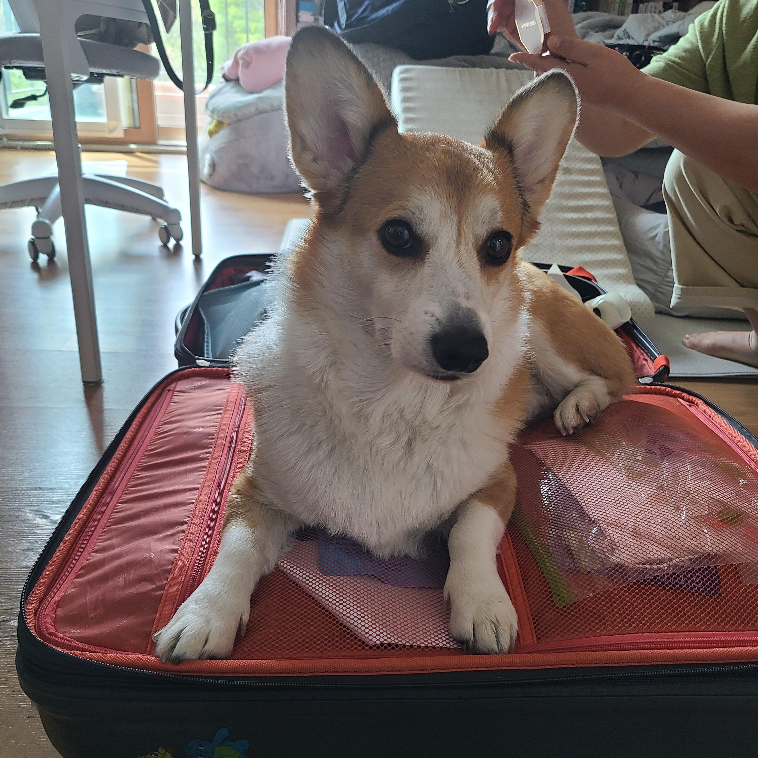 출발 전 택이가 여행가방에 버티고 앉아서 준비하는 엄마 챙겨줬어요.