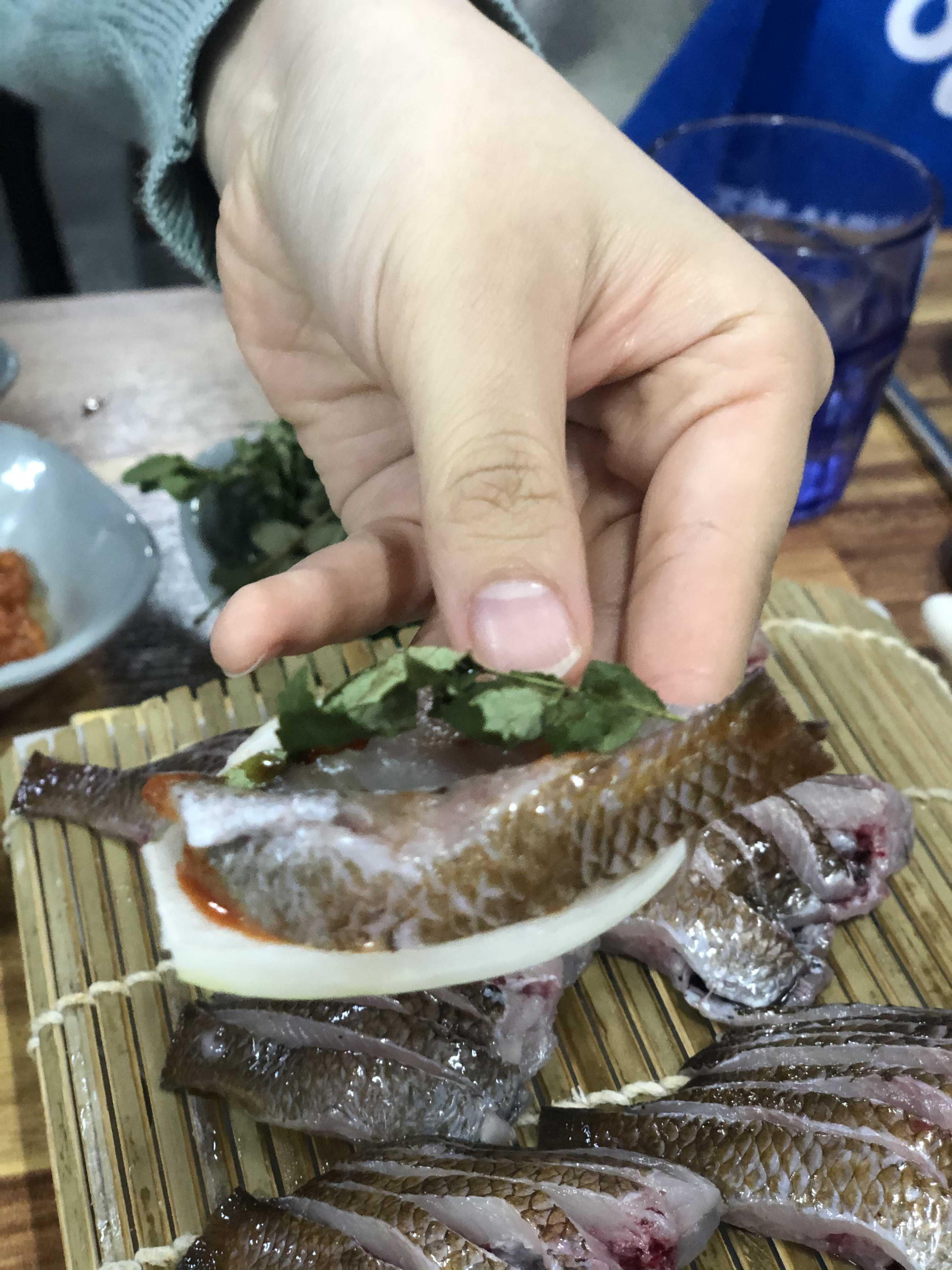뼈째먹는 자리는 세꼬시같은데 양파와 산초잎과 함께 꼭꼭 씹어서 먹으면 고소하고 산뜩하고 칼슘 가득한 자리맛을 즐길 수 있어요. 초보라 깻잎에 싸 먹으니 훨씬 고소하네요.