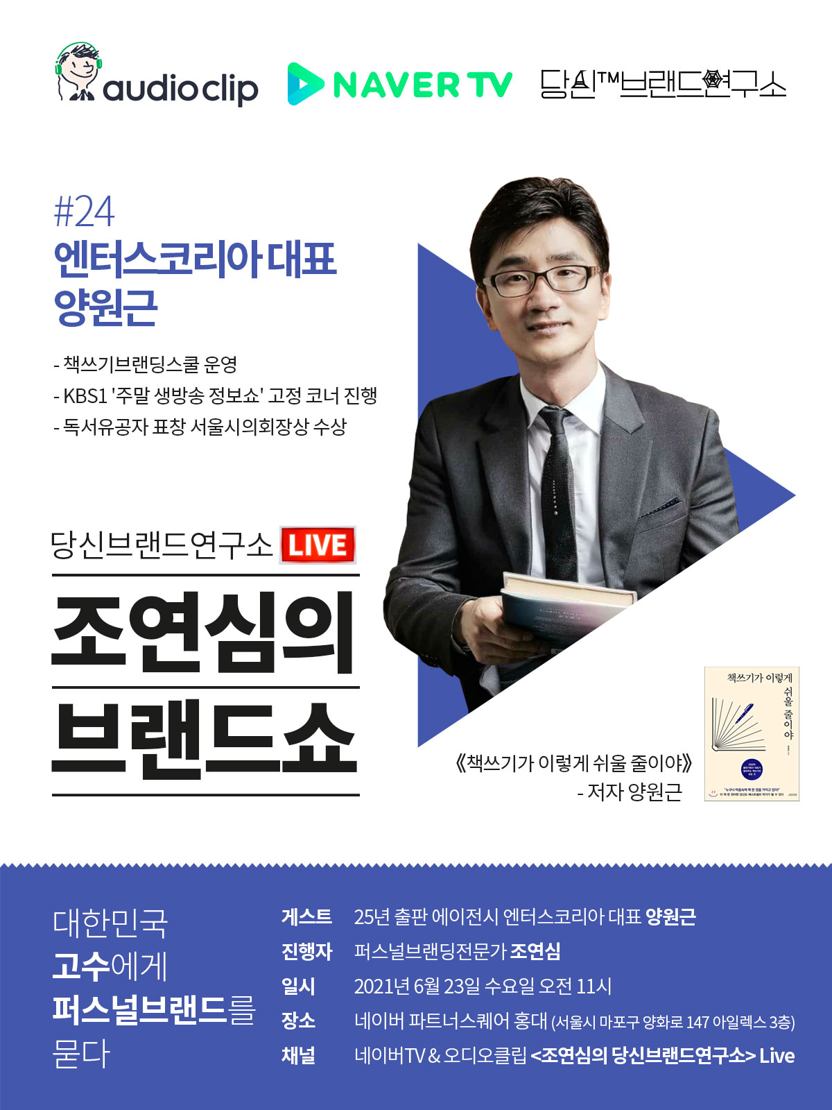네이버 오디오클립 당신브랜드연구소 & 네이버TV 동시 라이브 - 조연심의브랜드쇼- <책쓰기가 이렇게 쉬울줄이야> 양원근 엔터스코리아 대표 편