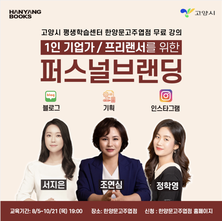 퍼스널브랜딩을 위한 컨설팅에서 내가 가장 중요하게 생각하는 것은 #아이덴터티 정체성을 정의하는 FAB 정리와 그에 맞는 프로젝트를 기획해서 오픈하도록 가이드하는 것이다. 기업을 매니징할 때도 이 프로세스를 그대로 적용한다. 2021년에는 고양시 평생학습센터 한양문고주엽점과 함께 퍼스널브랜드 기획 및 1:1 맞춤 브랜드컨설팅을 진행했다.