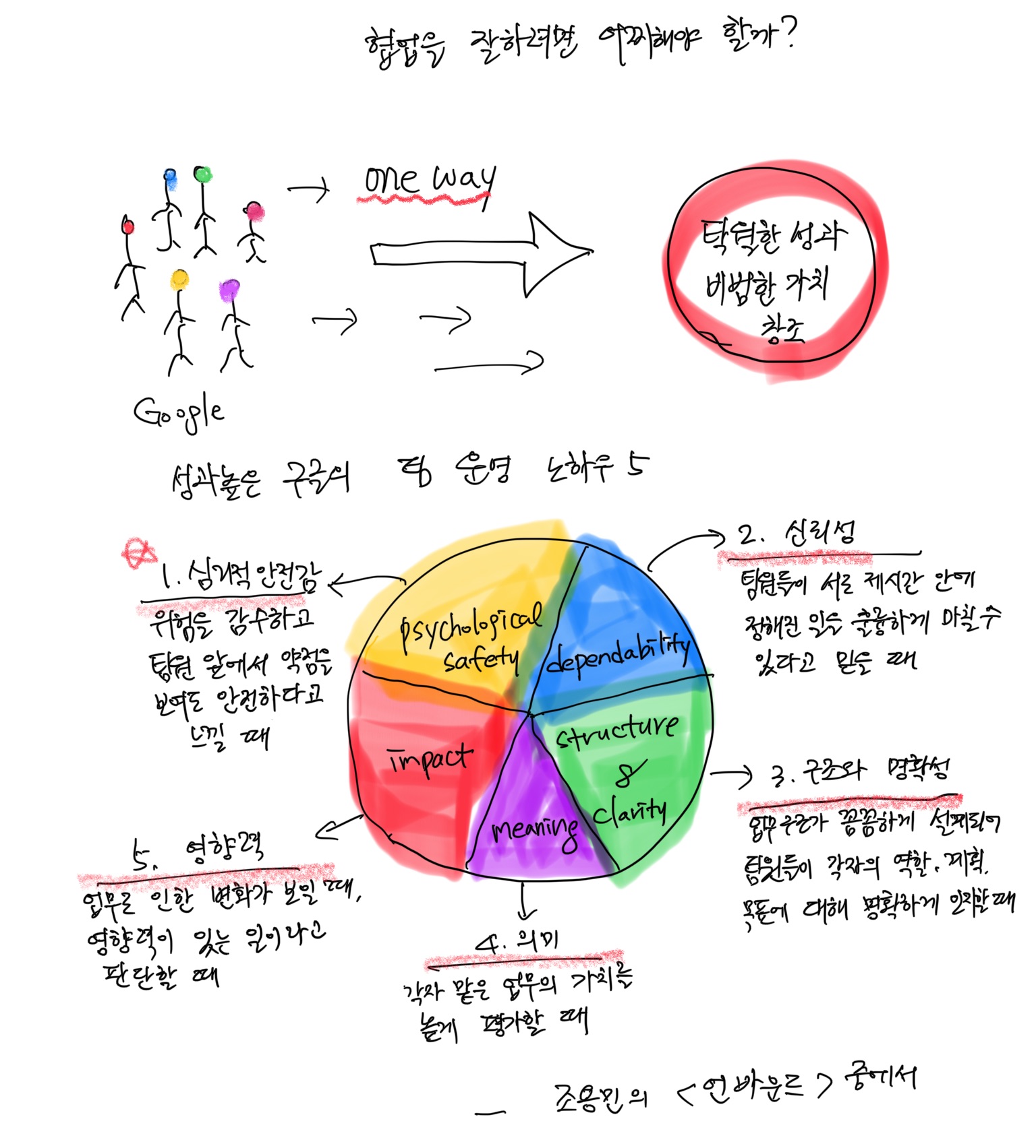 자신의 약점이 공격을 당하지 않을 거라는 심리적 안전감, 각자 제 몫은 당연히 해낼거라는 신뢰성, 무엇을 누가 어떻게 할 것인지에 대한 구조와 명확성, 내가 하는 일이 중요한 일이라고 여기는 의미부여, 지금 하는 일이 영향력이 있을 때 비범한 성과가 나온다.