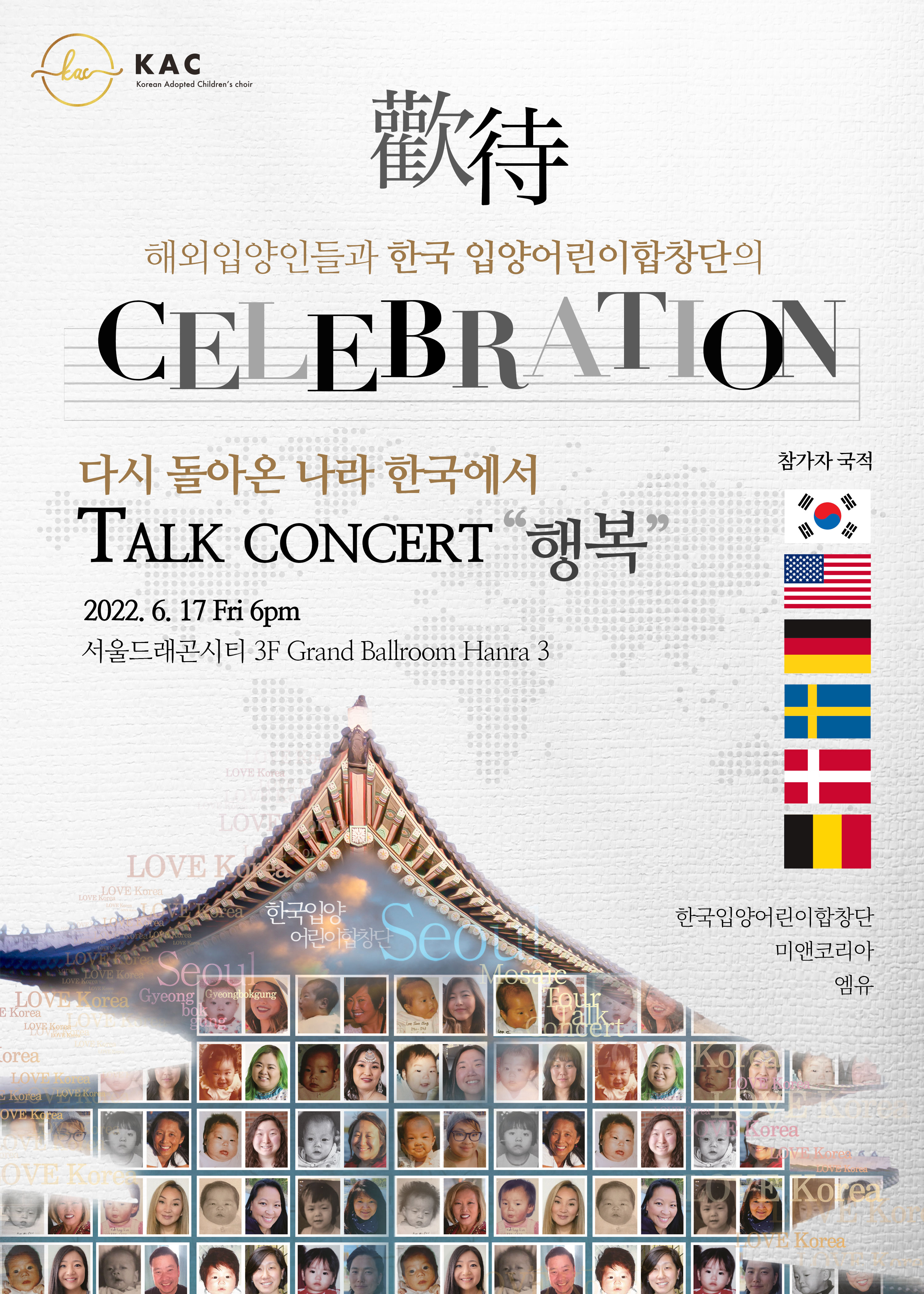 -해외 곳곳에 입양된 한국 입양인들을 한국입양어린이합창단이 환영하며 식사 와 음악 을 나누기 위해 마련된 자리 입니다 2012년 미국 케네디센터 공연을 시작으로 세계에 흩어져 있는 한국 입양인들과 문화를 통해 소통을 시작 했던 한국입양어린이합창단이 모국을 방문하는 해외입양인들과 함께 행복을 이야기 합니다 사는 곳과 언어는 달라도