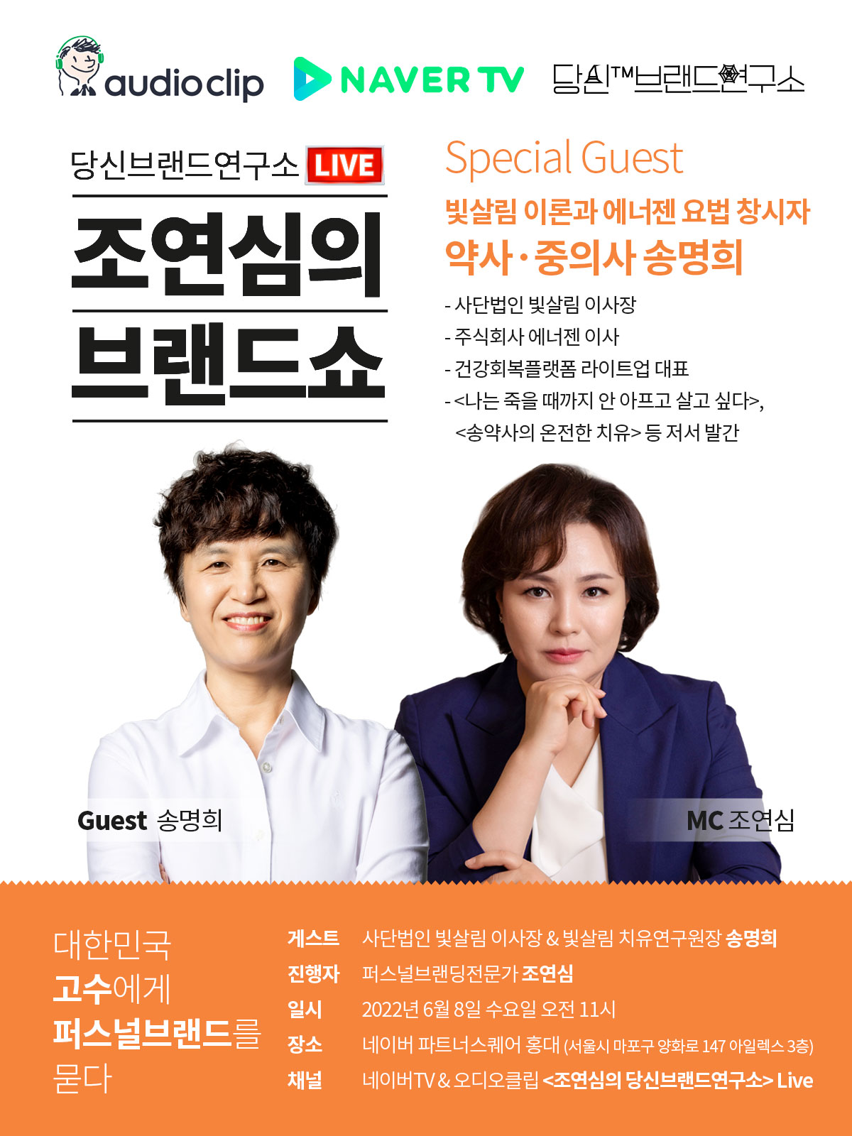 30년 넘게 약사들의 약사로, 온전한 치유를 꿈꾸는 사람들의 멘토로, 근원치료의 개발자로 함께 하고 있는 #송명희 대표님을 #당신브랜드연구소 #조연심의브랜드쇼에서 함께 합니다.