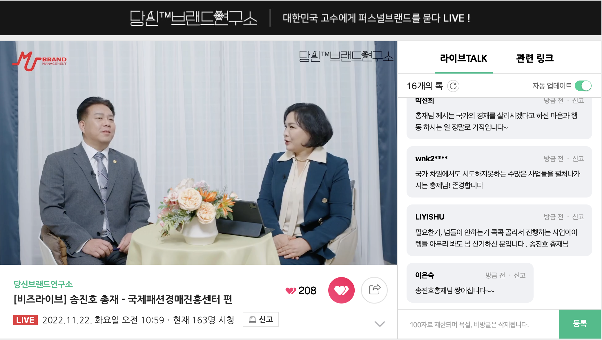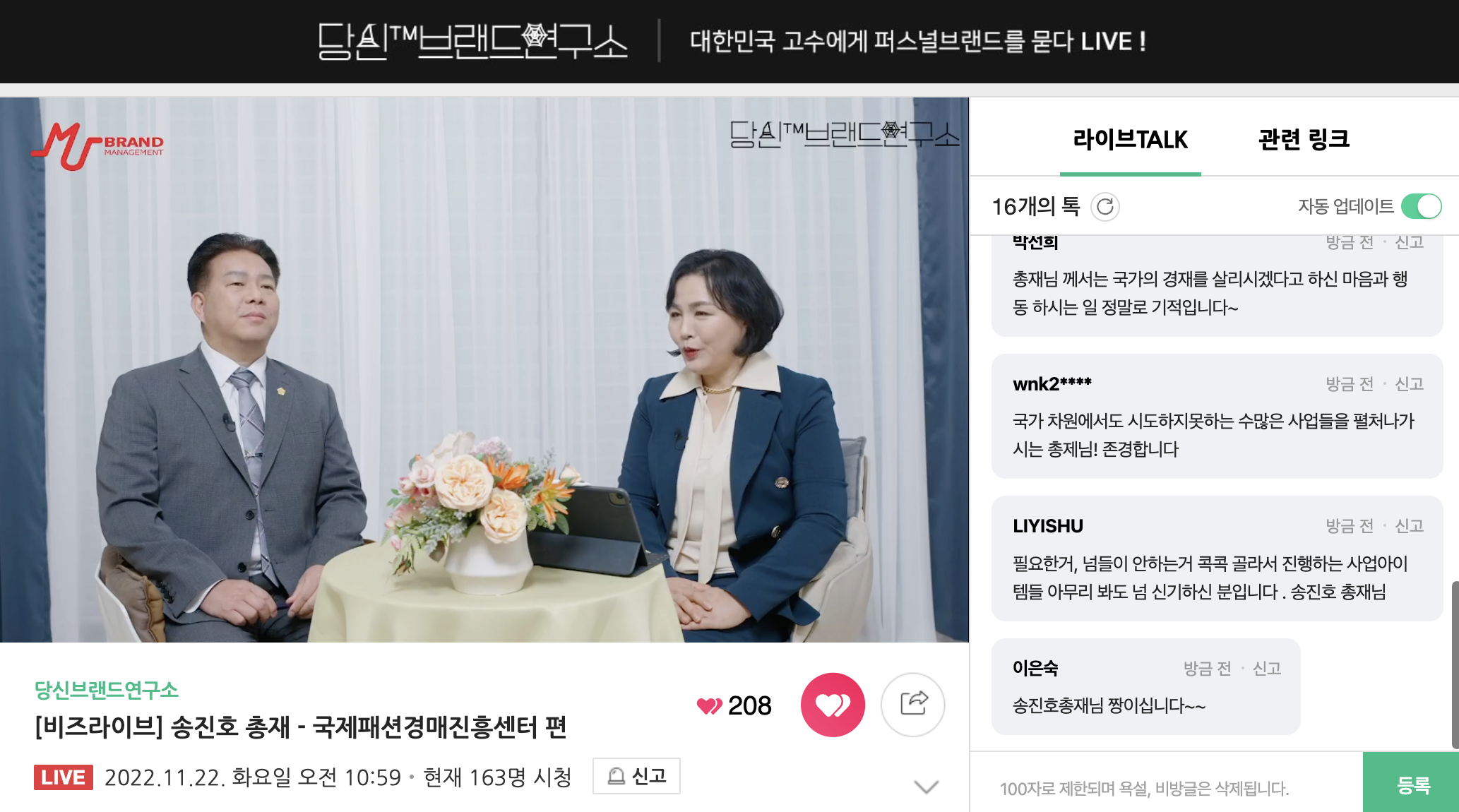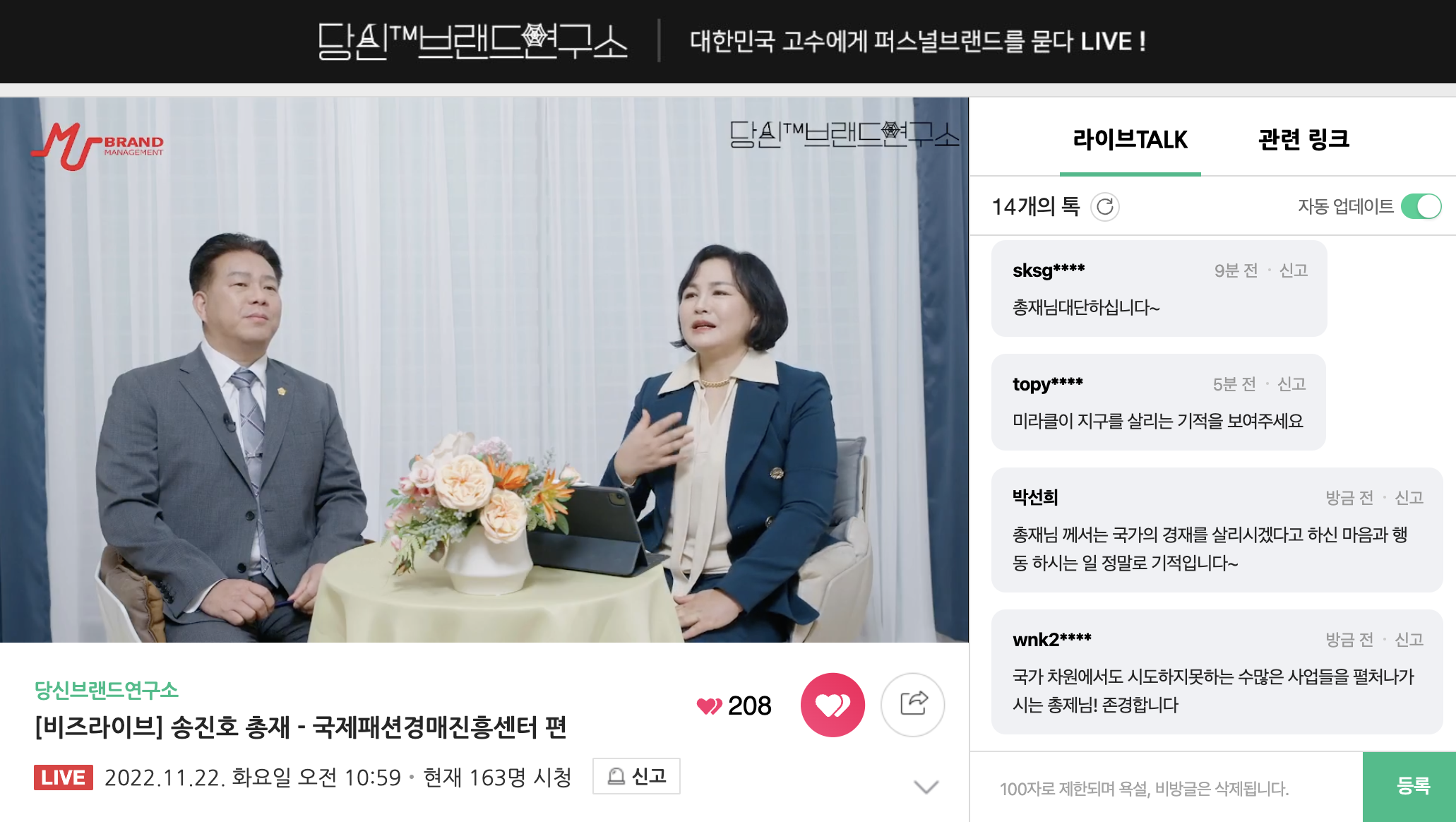 2022년 11월 22일 11시부터 "국제패션경매진흥센터 설립과 운영에 대하여" (주)미라클시티월드그룹 송진호 총재의 비즈라이브를 진행했어요.
