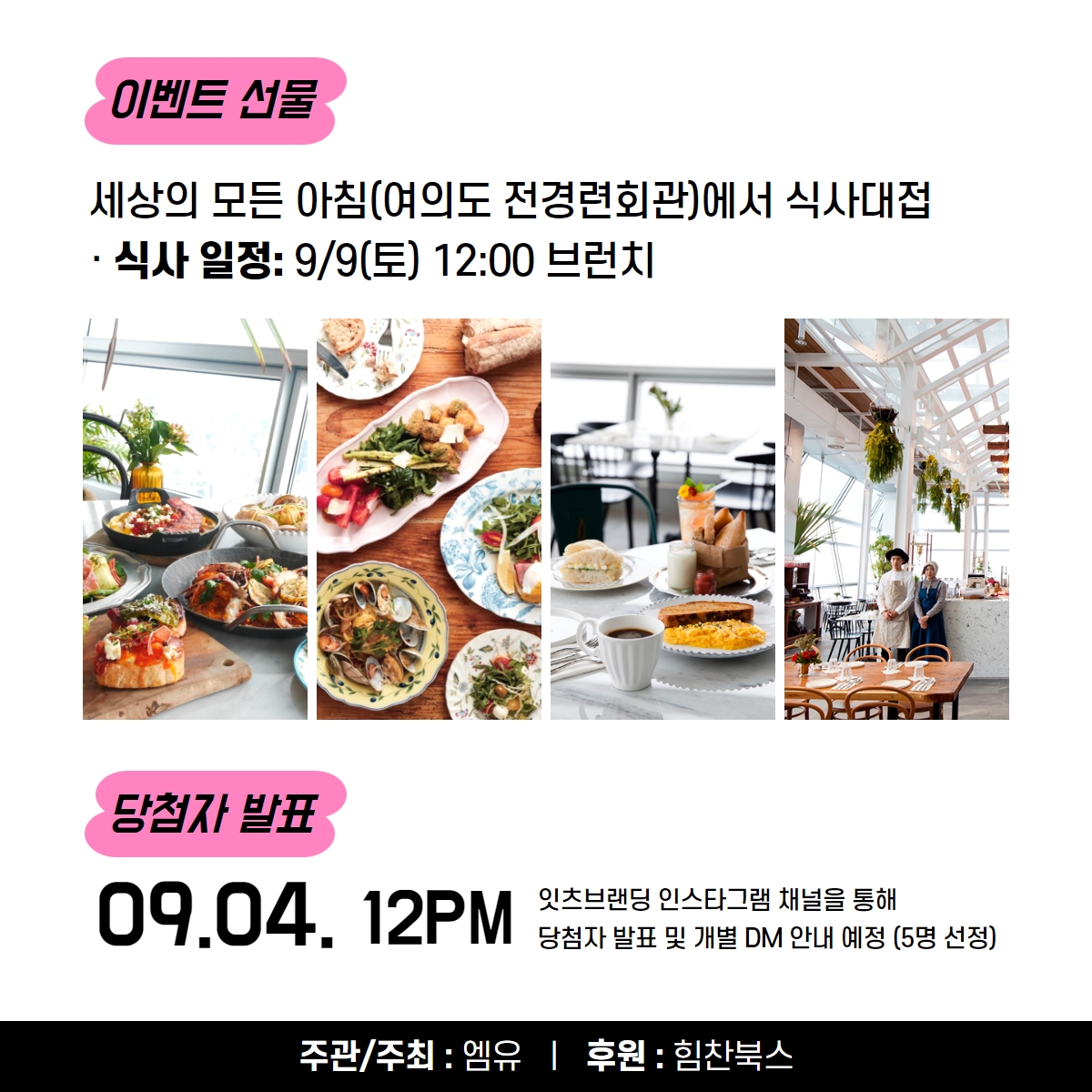 📍 이벤트에 참여해 주신 분들 중 추첨을 통해 5명을 선정하여 개별 다이렉트 메세지(DM)로 안내해드릴 예정입니다. dm 답변으로 [이름/연락처/브런치 참석가능여부]를 보내주셔야 당첨이 확정됩니다.