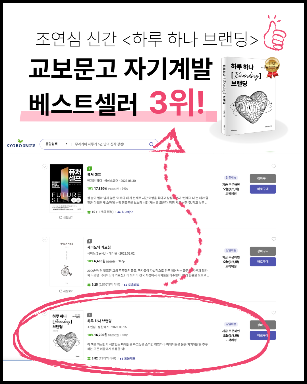 퍼스널브랜딩 고수 조연심 신간 하루하나브랜딩 교보문고 자기계발 베스트셀러 3위 /9월 5일자