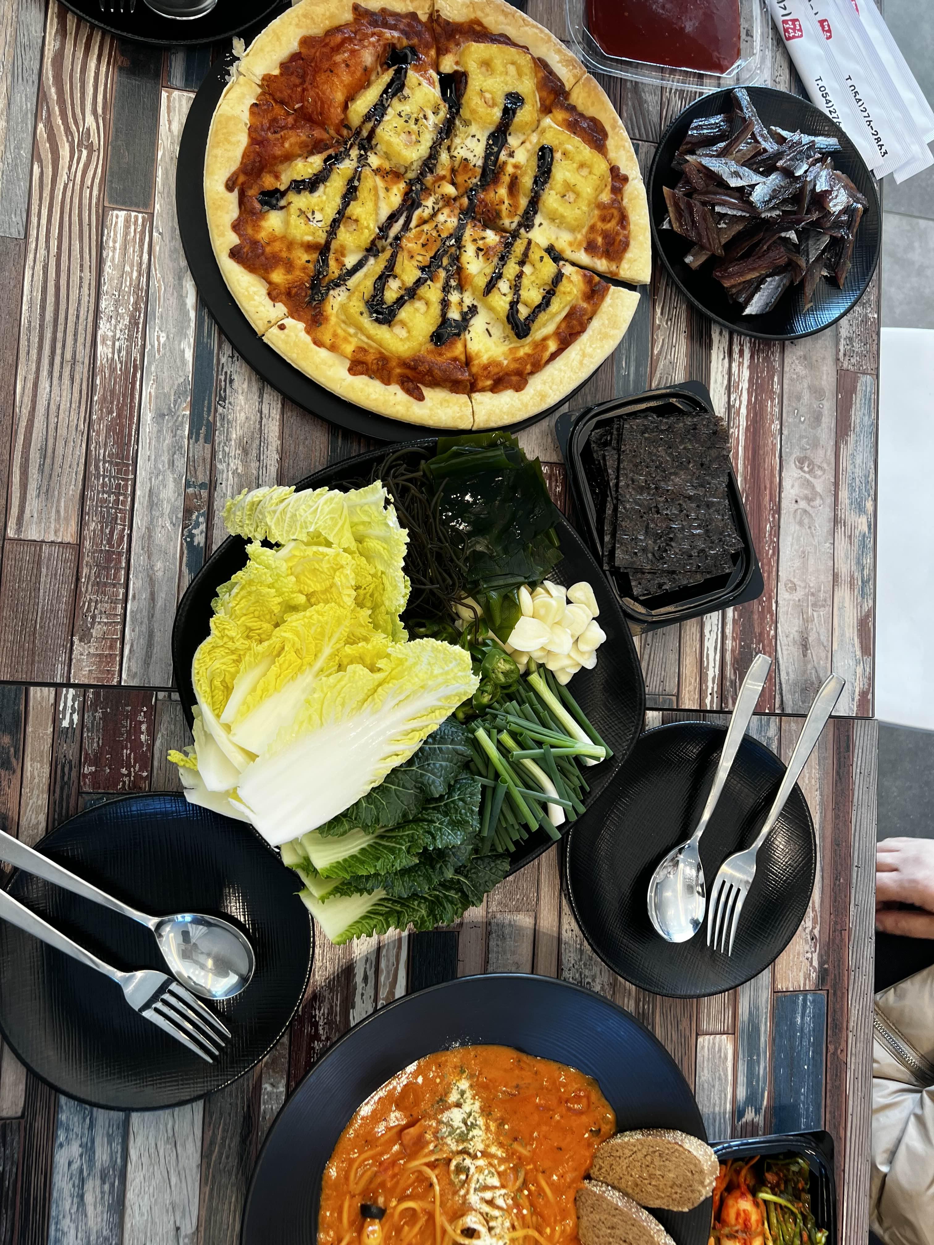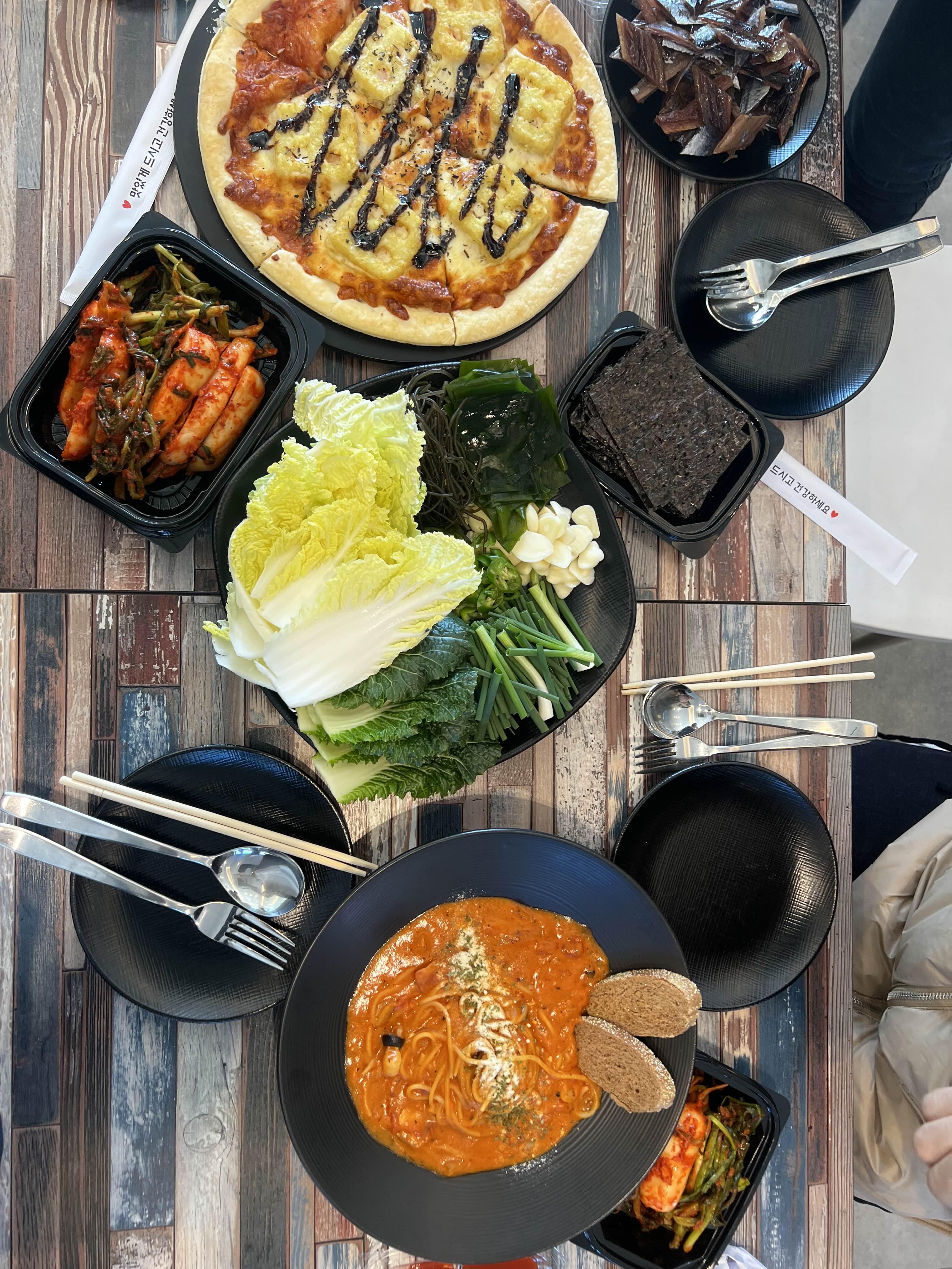 점심은 남양주 카페101 파크뷰 2층에서 피자, 떡볶이, 파스타에 구룡포과메기, 열무김치, 파김치로 맛나게 먹고