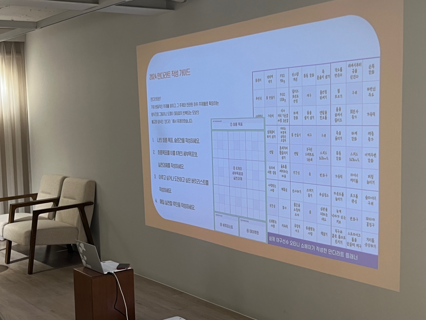 저자 특강 전 오드리책방 멤버 8기들간의 네트워킹 시간을 먼저 가졌어요. 만다라트 워크시트로 2024년을 계획해보고 서로 공유하면서 지혜를 배우게 됩니다.