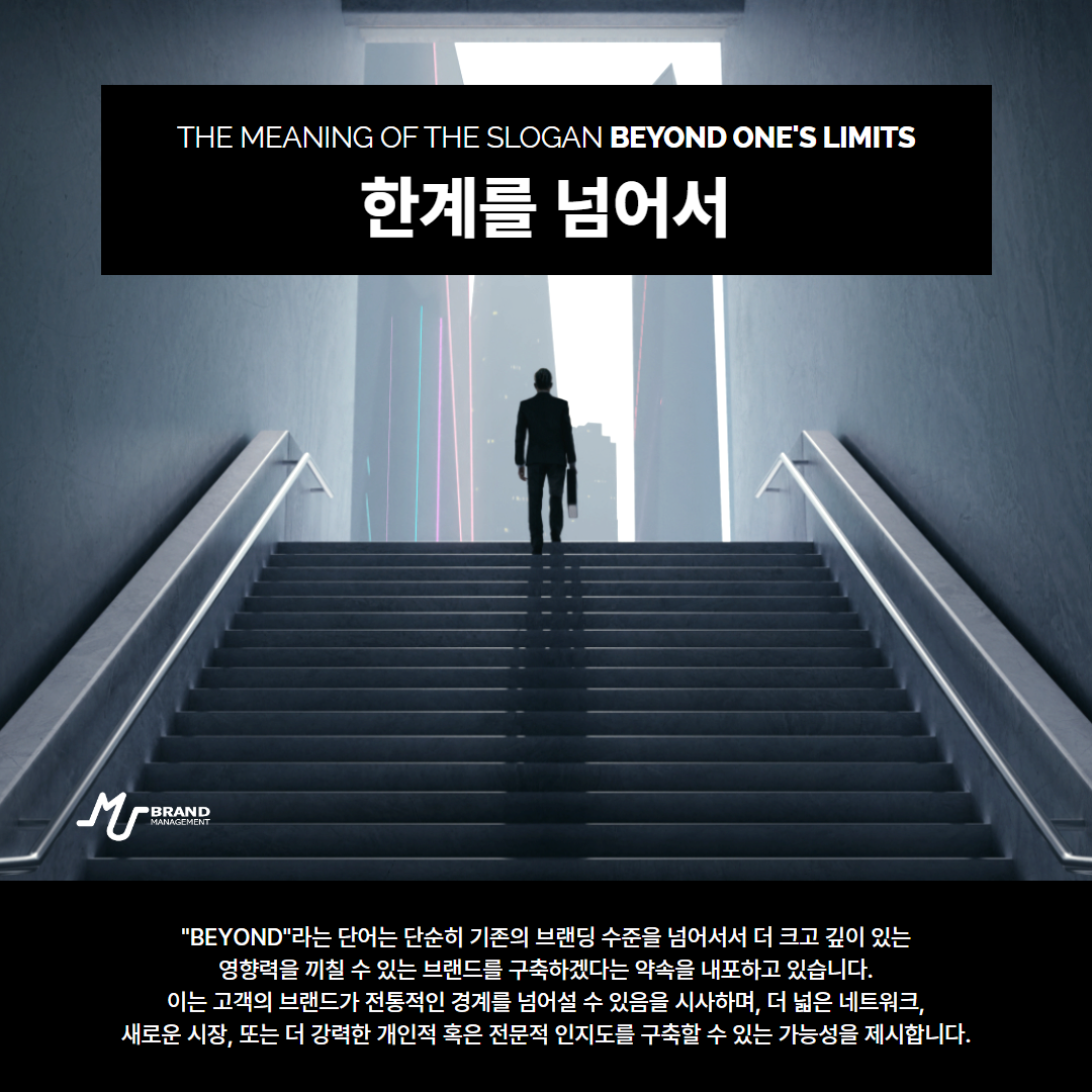 엠유의 슬로건 "Branding You Beyond"는 각 고객이 자신만의 독특한 브랜드를 구축하고, 그 브랜드를 통해 예상치 못한 성공과 기회의 영역까지 도달할 수 있도록 지원하겠다는 약속입니다. 엠유는 개인 또는 기업이 자신들의 잠재력을 최대한 발휘할 수 있도록 돕겠습니다.
