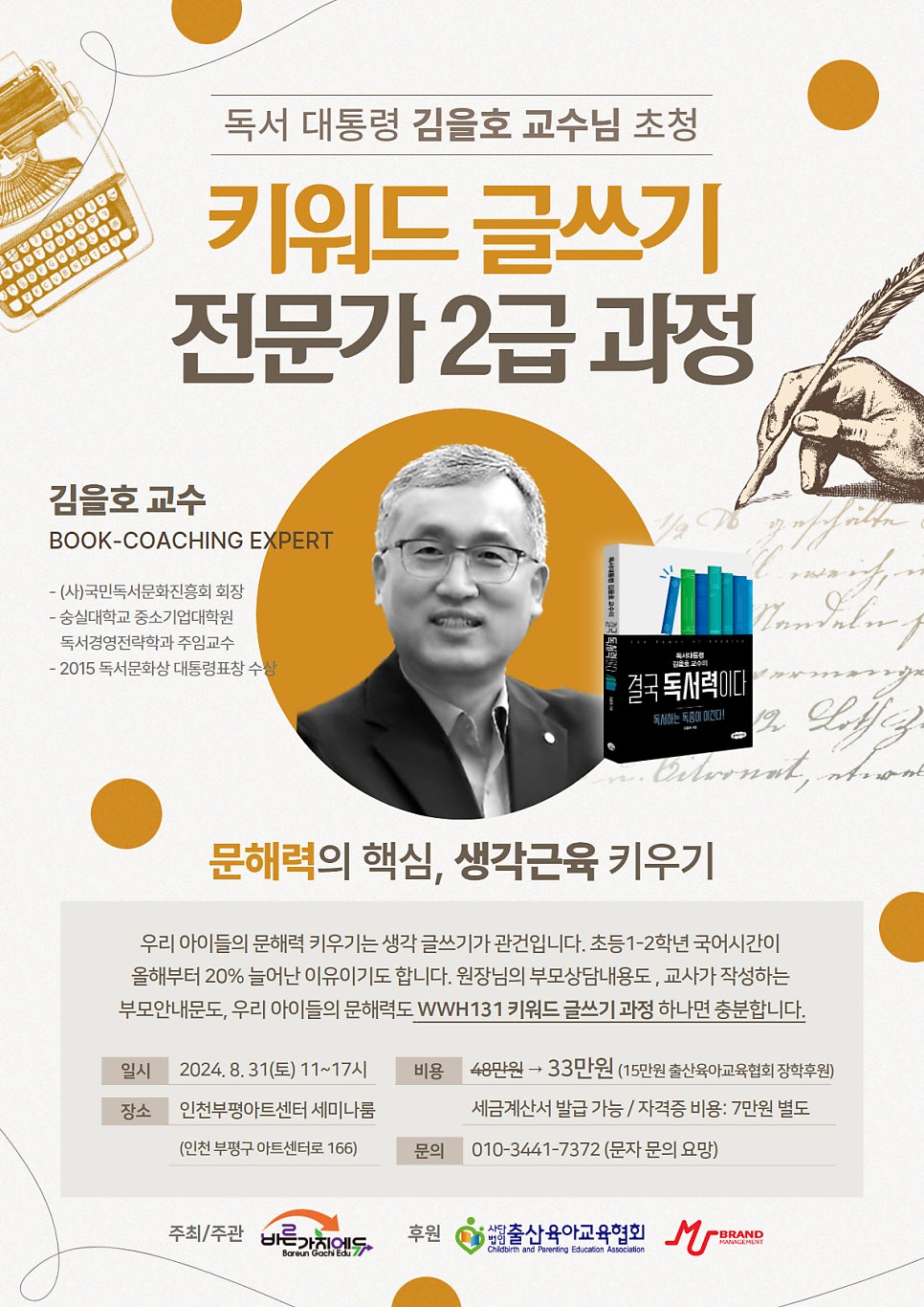 2024년 8월 31일 토요일 11-17시 인천부평아트센터 세미나룸에서 키워드 글쓰기 전문가 2급 과정이 진행됩니다. 독서대통령 김을호 교수님이 진행하는 키워드 글쓰기 전문가 2급 과정은 김을호