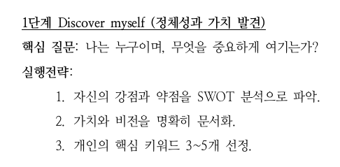 먼저 자신을 제대로 이해하는 것이 중요합니다. 자아탐색을 통해 자신의 취미, 적성, 가치, 성격, 강점, 비전을 정리하고 이를 기반으로 핵심 메시지를 정의하세요. 이는 브랜드의 기초이며 모든 활동의 기준점이 됩니다. 자신이 누구인지 정의하고 누구를 대상으로 무엇을 할 것인지 어필하고, 무엇을 줄 것인지 약속하는 자기소개 문장 FAB를 완성하는 단계입니다. 이를 위해 현재의 나(ASIS-Reality)를 이해하고 미래의 나(TOBE-Identity)를 정의하고 그 갭을 채우기 위한 브랜드 이미지 전략을 세워보는 단계입니다.