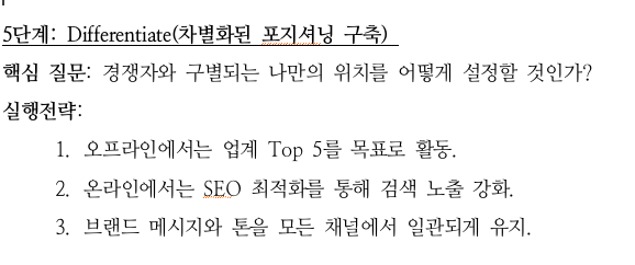 Differentiate는 온-오프라인 포지셔닝 구축 단계로 포지셔닝은 개인이 목표하는 분야에서 자신의 브랜드를 명확하게 드러내는 전략적 접근 방식입니다. 이 단계는 온-오프라인에서 차별화된 위치를 설정하여 경쟁자들과 구별되는 것이 목적입니다. 이 때 오프라인 포지셔닝은 해당 분야 Top 5 안에 포함되는 것을 목표로 하고, 온라인 포지셔닝은 구글을 비롯한 모든 SNS에서 의도한 브랜드 정체성대로 검색되는 것을 포함해 네이버 인물검색을 비롯한 모든 카테고리(책, 뉴스, 블로그, 동영상, 이미지 등)에서 검색되는 것을 목표로 하면 됩니다. 당신의 브랜드가 특정 시장 또는 네트워크에서 확고히 자리 잡을 수 있도록 노력하세요. 세미나, 강연, 워크숍 등의 활동으로 오프라인 포지셔닝을 강화하며, 온라인에서도 영향력을 확장해 갑니다.