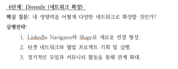 Diversify 네트워크 확장 단계는 자신의 영향력을 분산하여 다양한 네트워크로 확장하는 단계로 퍼스널 브랜딩의 성공을 위해 필수적인 요소입니다. 개인 브랜드는 네트워킹을 통해 성장합니다. 업계 전문가, 멘토, 동료와의 관계를 형성하고 이를 통해 기회를 발견하세요. 주기적인 소통과 협업이 중요합니다.