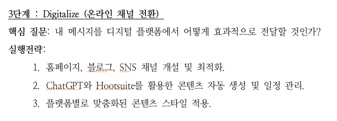 이 프로세스는 생성형 AI 도구와 결합할 때 더욱 강력해집니다. 예를 들어, AI를 활용해 텍스트 콘텐츠를 생성하거나 디자인을 자동화할 수 있습니다. 이를 통해 시간과 비용을 절약하면서도 효율적이고 창의적인 브랜딩이 가능합니다.