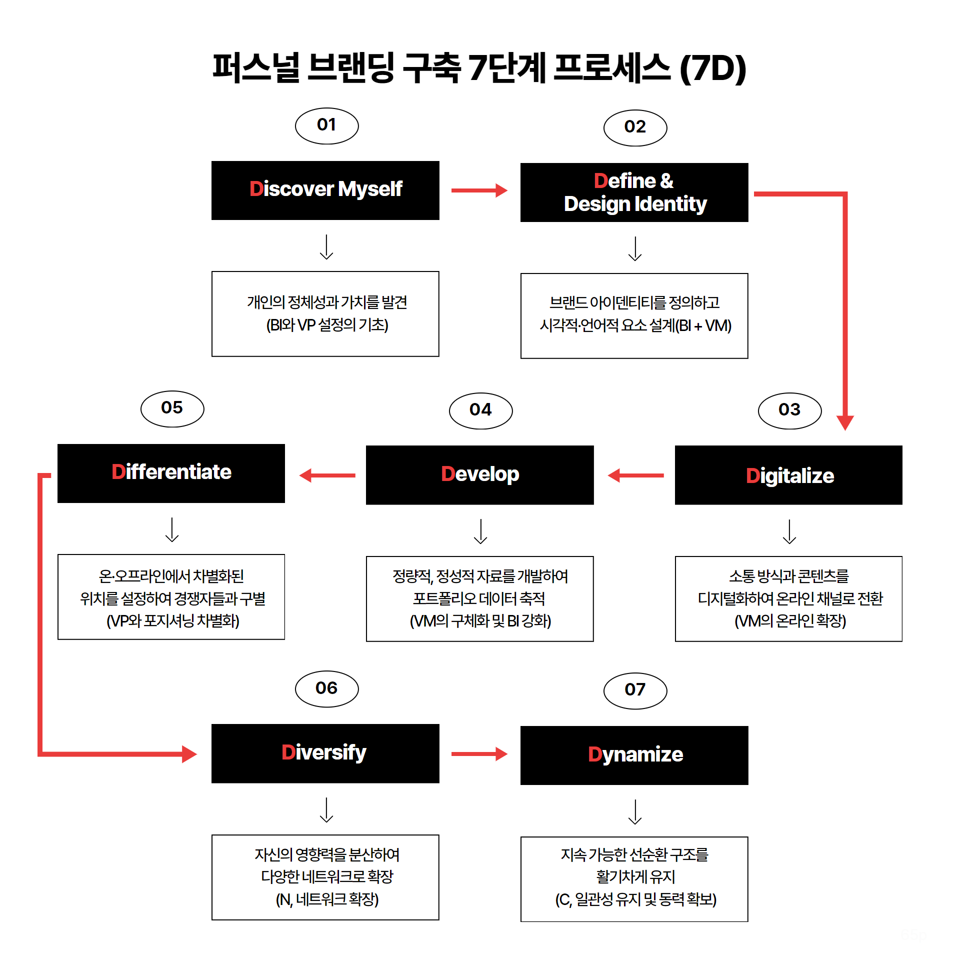 현대 사회에서 퍼스널 브랜딩은 단순한 트렌드를 넘어 필수적인 자기 표현 수단이 되고 있습니다. 특히 디지털 환경이 주도하는 시대에는 온라인과 오프라인에서의 일관된 아이덴티티가 개인의 성공을 좌우하기도 합니다. 오늘 소개할 <7단계 퍼스널 브랜딩 프로세스(7D)>는 효과적인 전략 설계로 당신만의 브랜드를 구축하는 데 도움을 줄 것입니다.