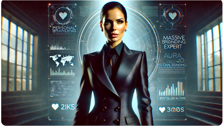 나: 배경은 어둡고 세련된 비즈니스 수트, 예리한 눈빛, 그리고 강력한 리더십이 느껴지는 자세, 배경도 퍼스널 브랜딩 차트, SNS 반응, 미래적인 무대 디자인, 대중 앞에서 주목받는 이미지를 잘 표현해 주면 좋겠어. 어둡고 세련된 비즈니스 수트, 예리한 눈빛, 그리고 강력한 리더십이 느껴지는 자세를 강조, Aura Jo가 더욱 강렬하고 카리스마 넘치는 포스로 표현해 줘.