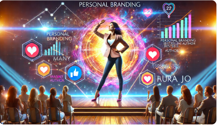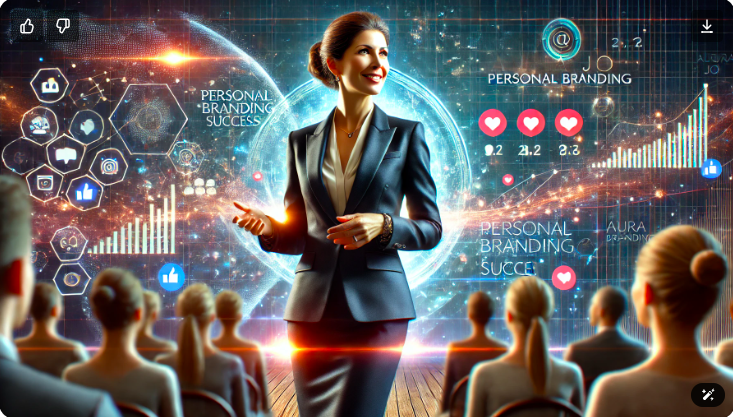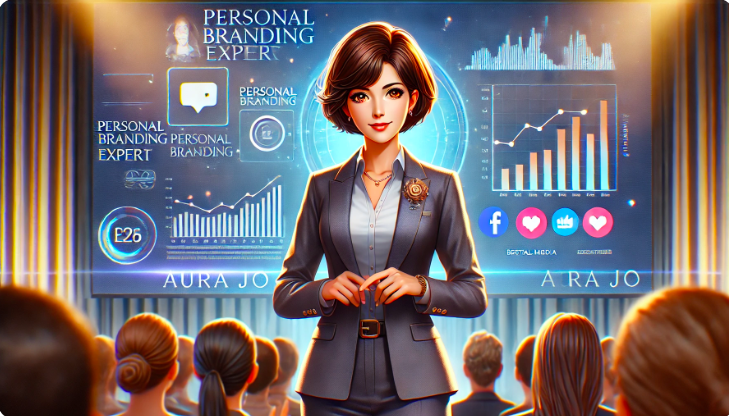 나: 페르소나브랜드 퍼스널브랜딩일인자 Aura 조가 대중들 앞에서 멋진 포즈로 강연하고 있는 모습을 그려줘. 배경에는 디지털 아트가 있고, 퍼스널 브랜딩 관련 차트, 좋아요, 하트를 많이 받은 SNS 인증 모습, 베스트셀러 작가로 축하받는 모습 등이 배경에 포함되면 좋겠어.