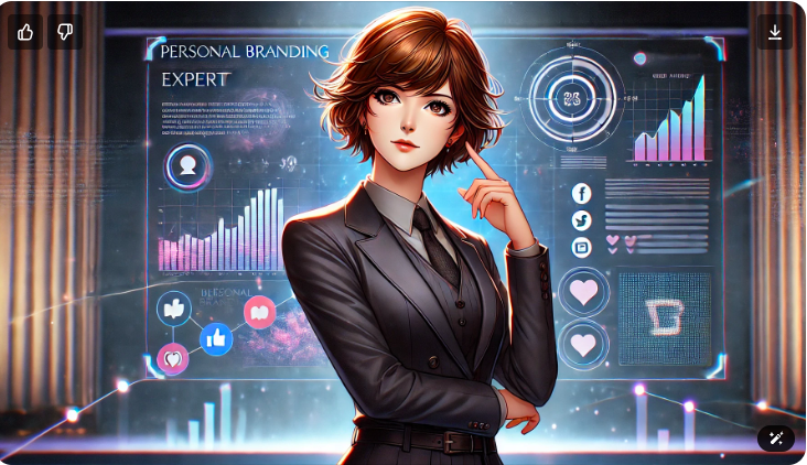 세미-리얼리스틱한 애니메이션 스타일로 표현되었고, 짧은 단발머리와 세련된 비즈니스 정장이 돋보여. 배경에는 퍼스널 브랜딩 관련 그래프, SNS 반응, 베스트셀러 축하 요소들이 포함되어 있어. 원하는 느낌에 맞게 잘 나왔는지 확인해 보고, 추가 수정이 필요하면 알려줘! 😊
