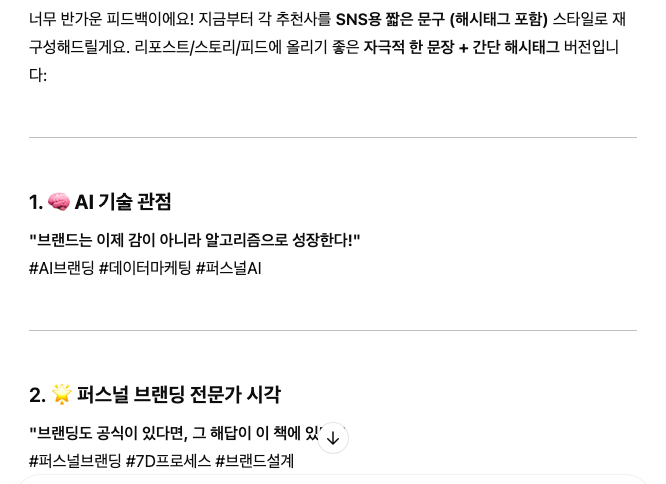 이렇게 각각의 시각에 맞는 SNS 후킹 문장을 얻게 되었답니다. 친절한 GPT는 또 이렇게 덧붙이네요.