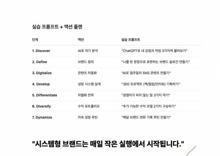 강의에서 배운 7D 프로세스를 바탕으로, 하루 하나씩 작지만 꾸준한 실행으로 내 브랜드 시스템을 만들겠습니다.