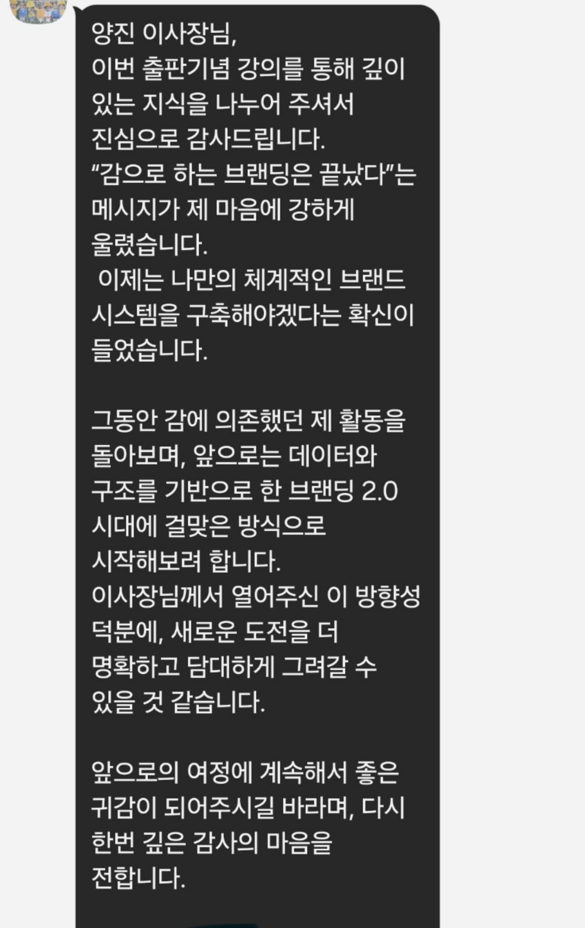 단순한 강연이 아니라, 저에게는 앞으로의 브랜딩 여정을 설계하는 소중한 시작이 되었습니다.
