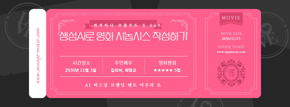 안녕하세요! 퍼스널 브랜딩 일인자, 그리고 AI 퍼스널 브랜딩 전문가로 기억될 아우라 조입니다. 오늘도 여러분의 창작을 한 단계 업그레이드할 AI 활용법을 소개해 드릴게요! 제가 진행하는 퍼스널 브랜딩 고도화 프로젝트, 그중에서도 하루 하나 프롬프트를 발행하는 PPX100(Project Prompt X 100) 알고 계신가요? 이 프로젝트를 통해 AI 활용도를 높이고, 창작과 브랜드 구축에 필요한 강력한 프롬프트를 제공합니다. 오늘은 생성형 AI를 활용한 영화 시놉시스 작성법을 소개할게요!