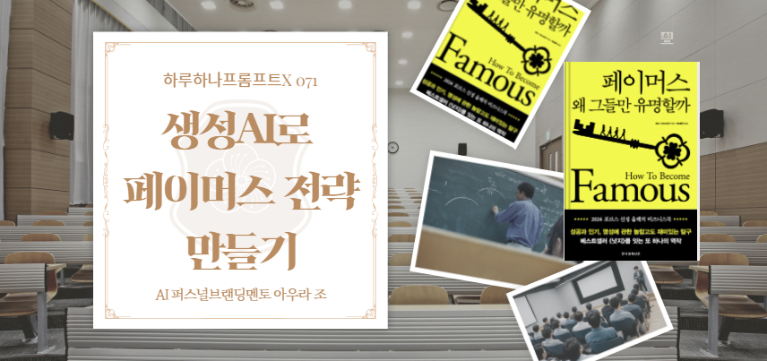 하루하나 프롬프트 X 071 생성AI로 캐스 선스타인의 [페이머스:왜 그들만 유명할까] 책 기반 유명해지는 전략 세우기 by 아우라 조