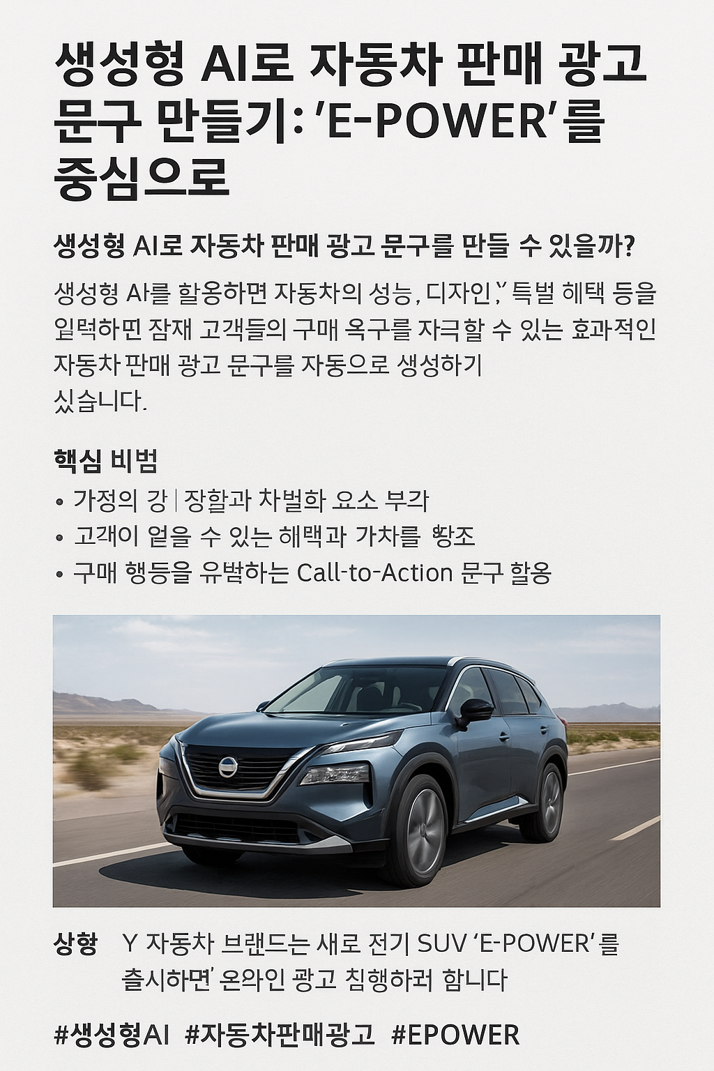 이제 Y 브랜드의 신형 전기 SUV 'E-POWER'를 대상으로 생성형 AI를 활용해 만든 광고 문구를 살펴보겠습니다.