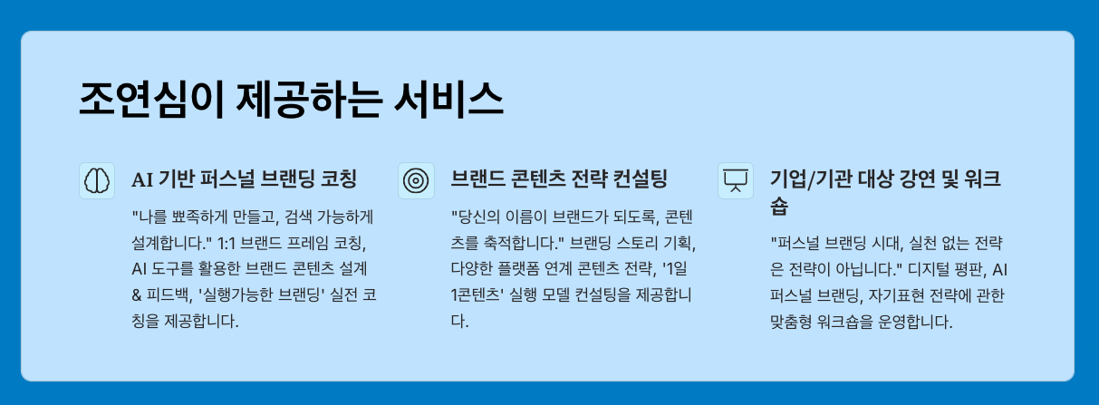 | “조연심의 1일 1콘텐츠 실천기” | 책/브런치/SNS | 브랜딩 실행 노하우 전파 |
